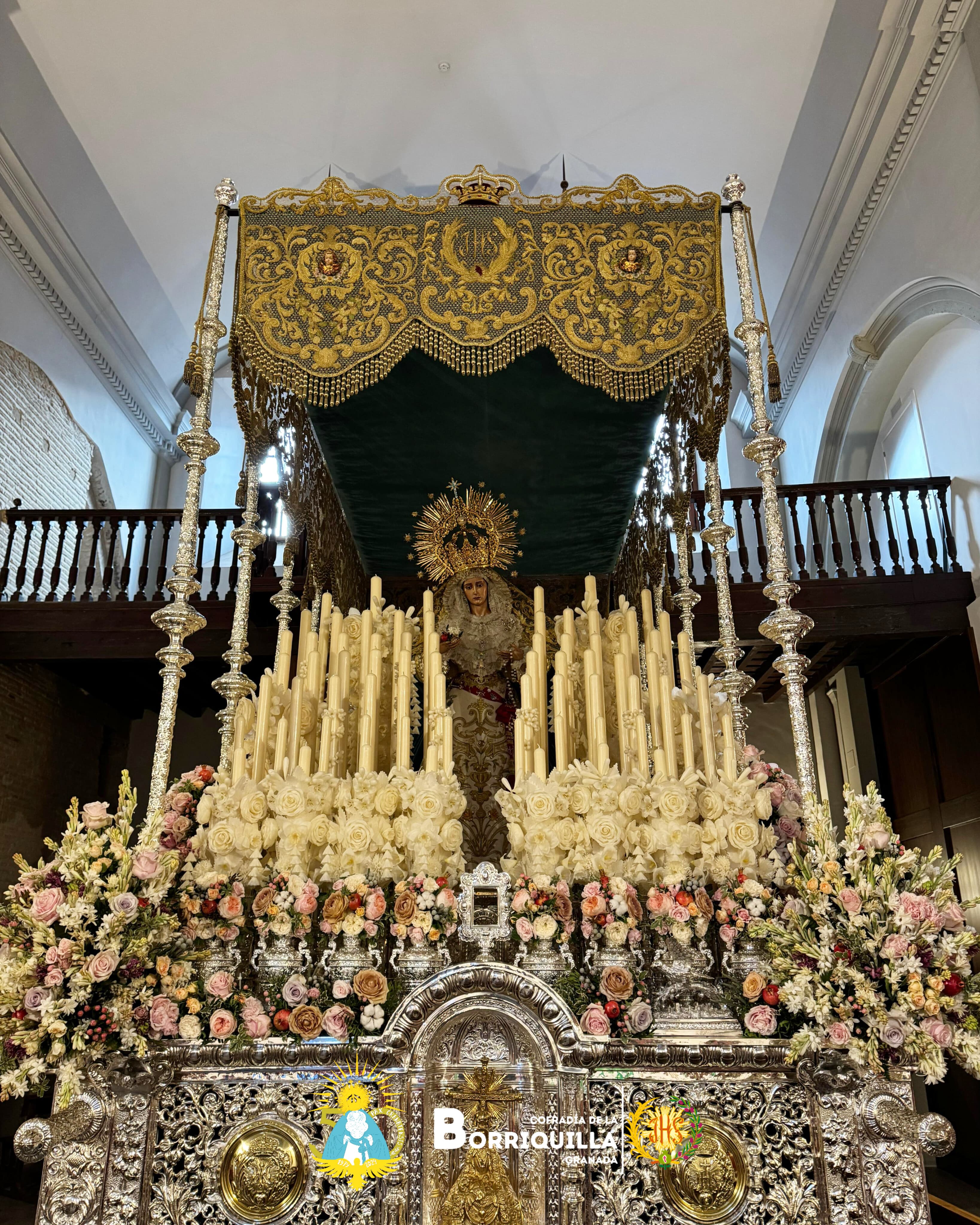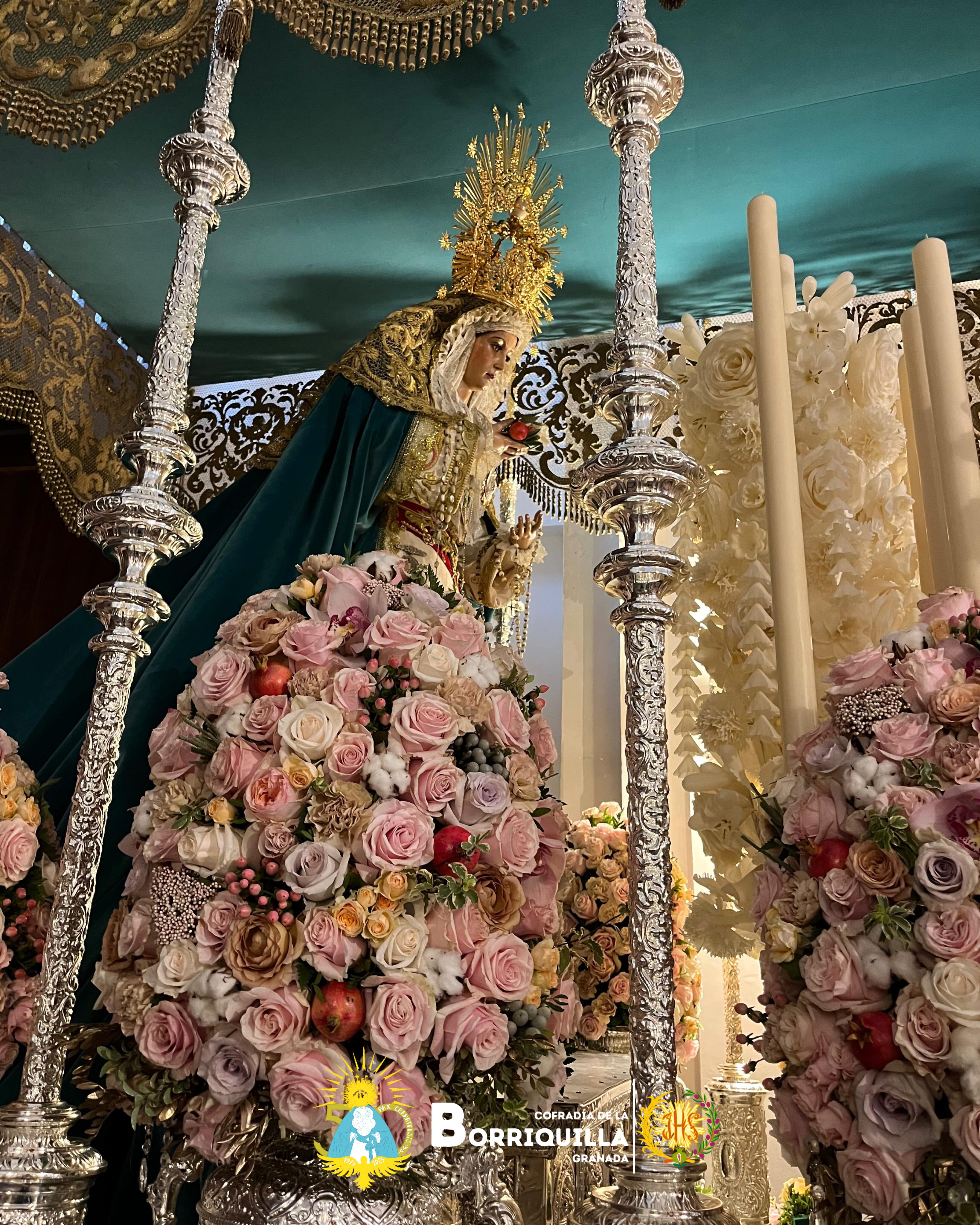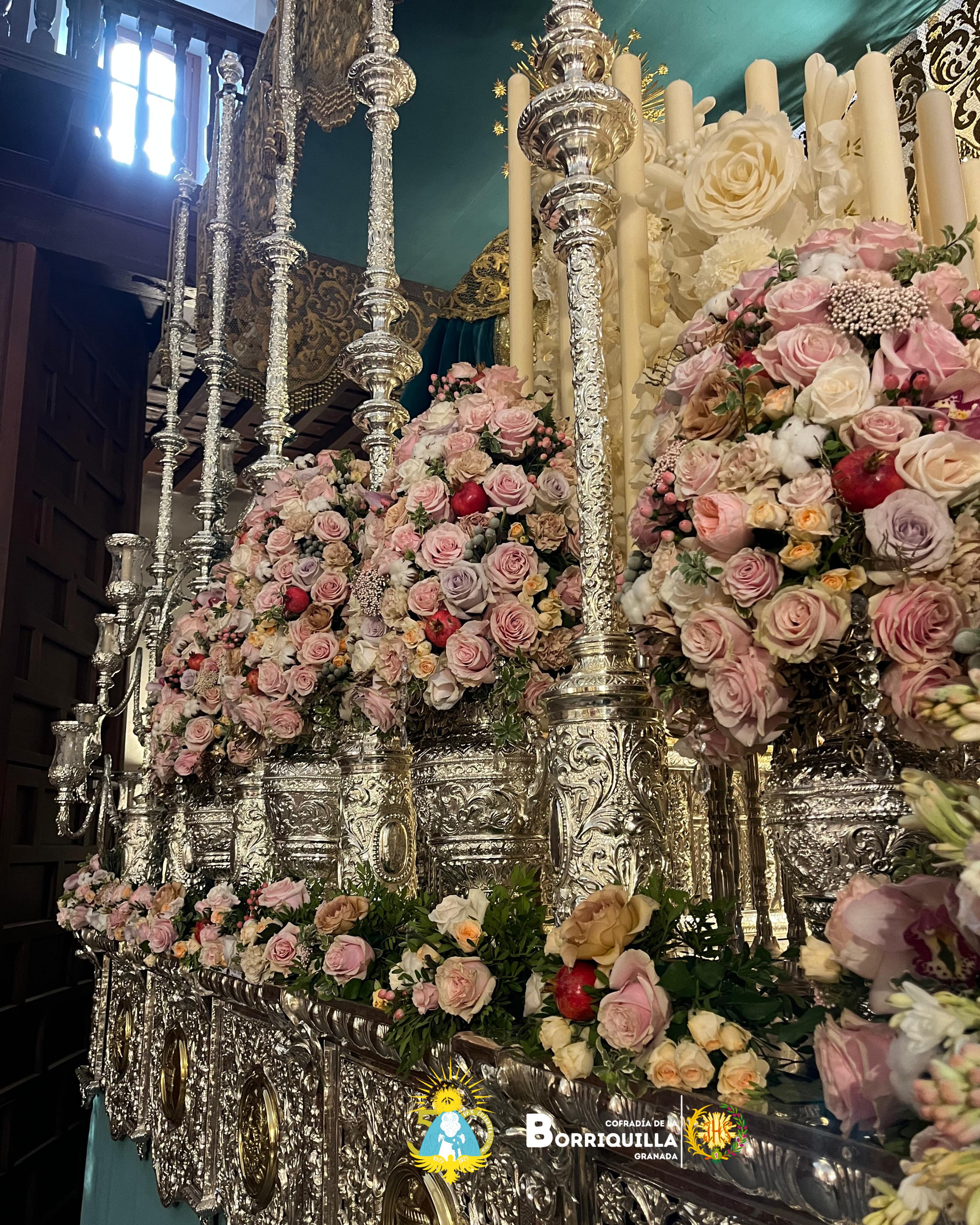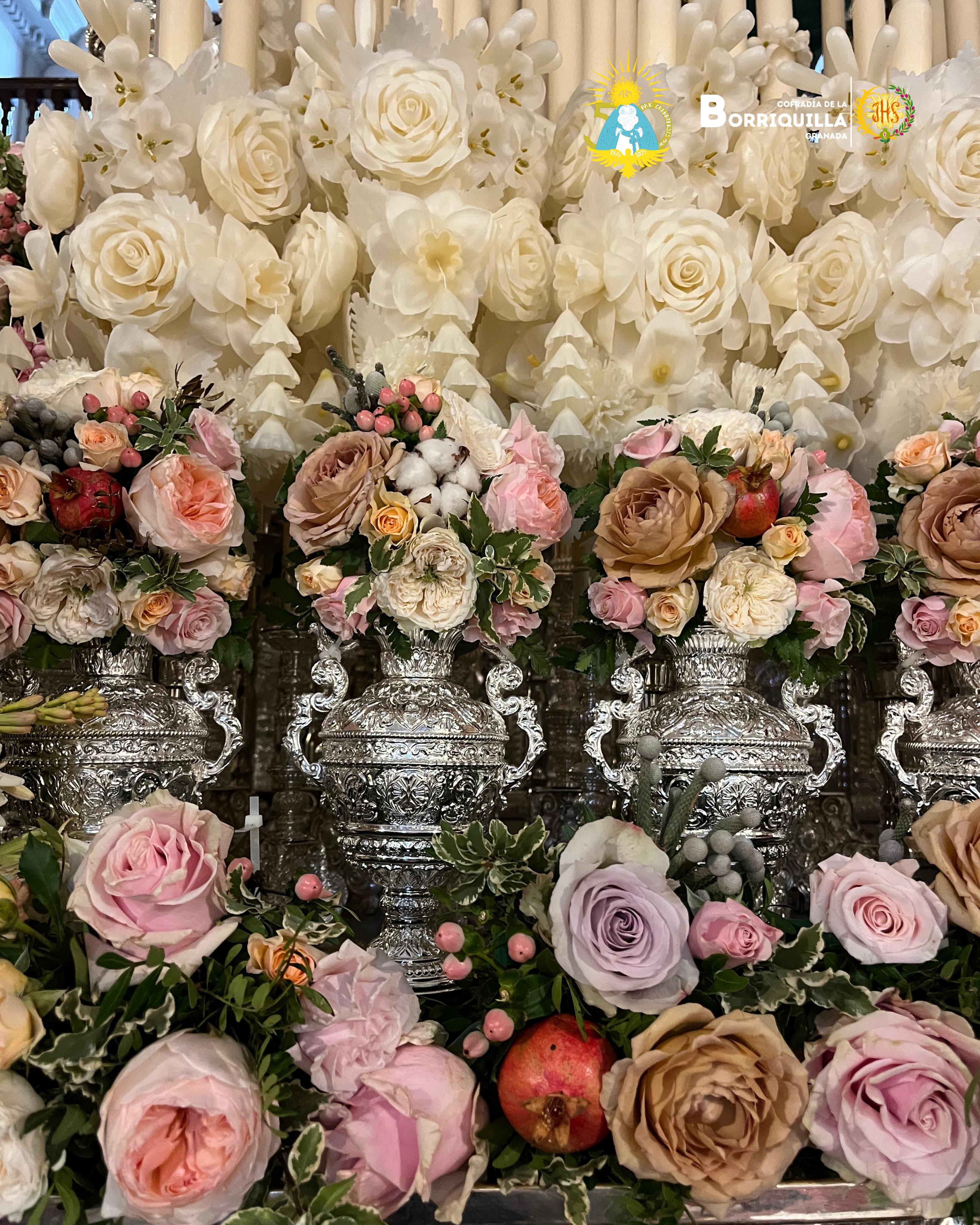 Nuestra Señora de la Paz ha amanecido bajo su palio, decorado con un exorno floral de gran delicadeza y profundo simbolismo. Las flores que la acompañan incluyen rosas de variedades como Quicksand, Vendela y Faith, junto con detalles de hipericum rosa claro, jacintos y claveles caramel. También destacan elementos como ramificada crema y rosa, helecho, lentisco, y la emblemática flor de nardo, que fue también protagonista en la procesión de la Virgen de las Angustias. Además, se han incorporado flores tan especiales como la orquídea en tono empolvado y el algodón.