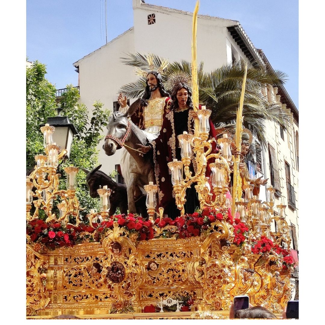 En el paso de palio se pudo observar un exorno más variado, en los tonos que normalmente acompañan a Nuestra Señora de la Paz cada Domingo de Ramos. Este exorno estaba compuesto por rosas rosas, rosa vendela, orquídeas rosas, statice blanco, calas blancas, symphoricarpos albus, flor de arroz y clavel rosa y blanco.