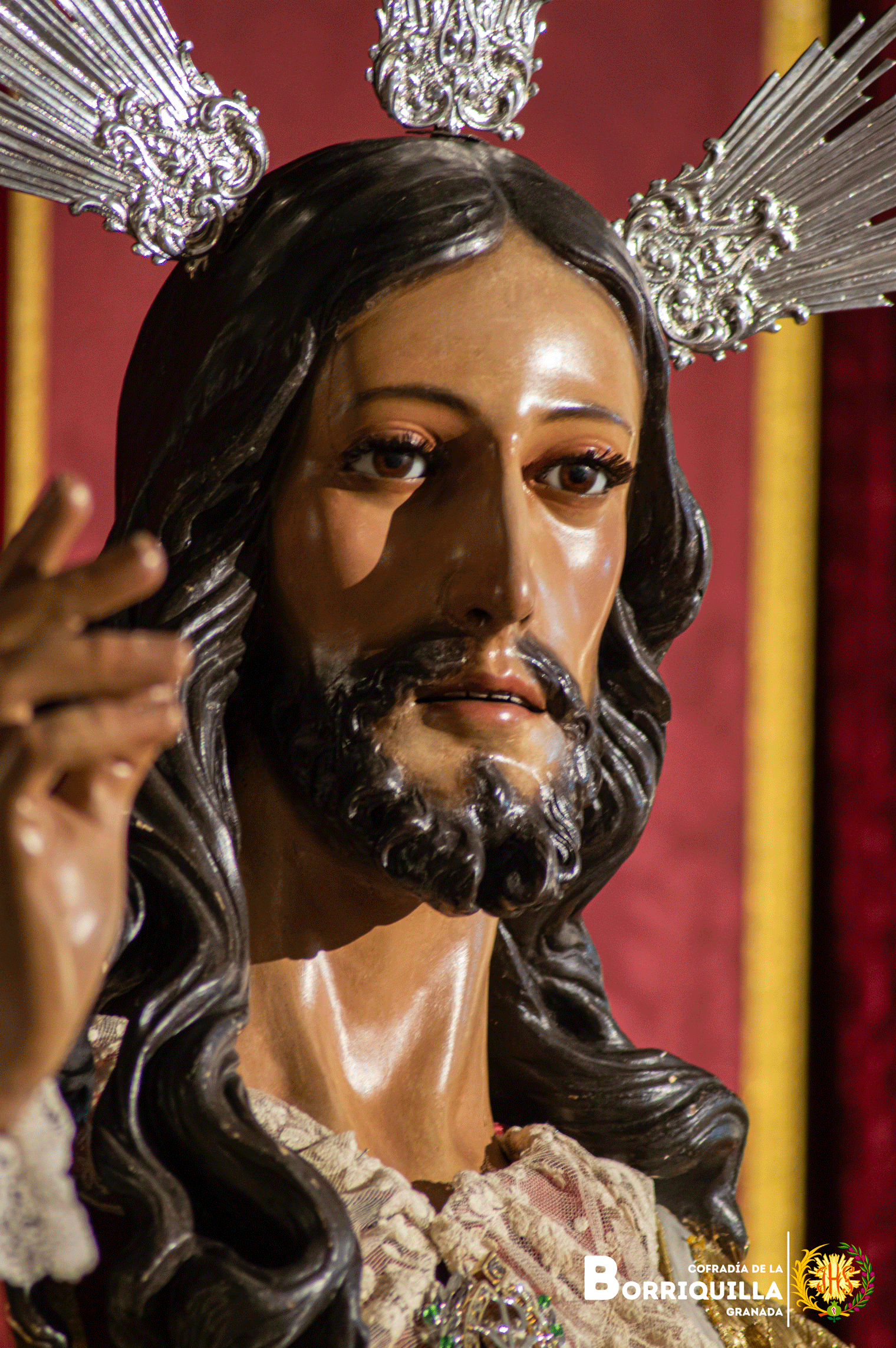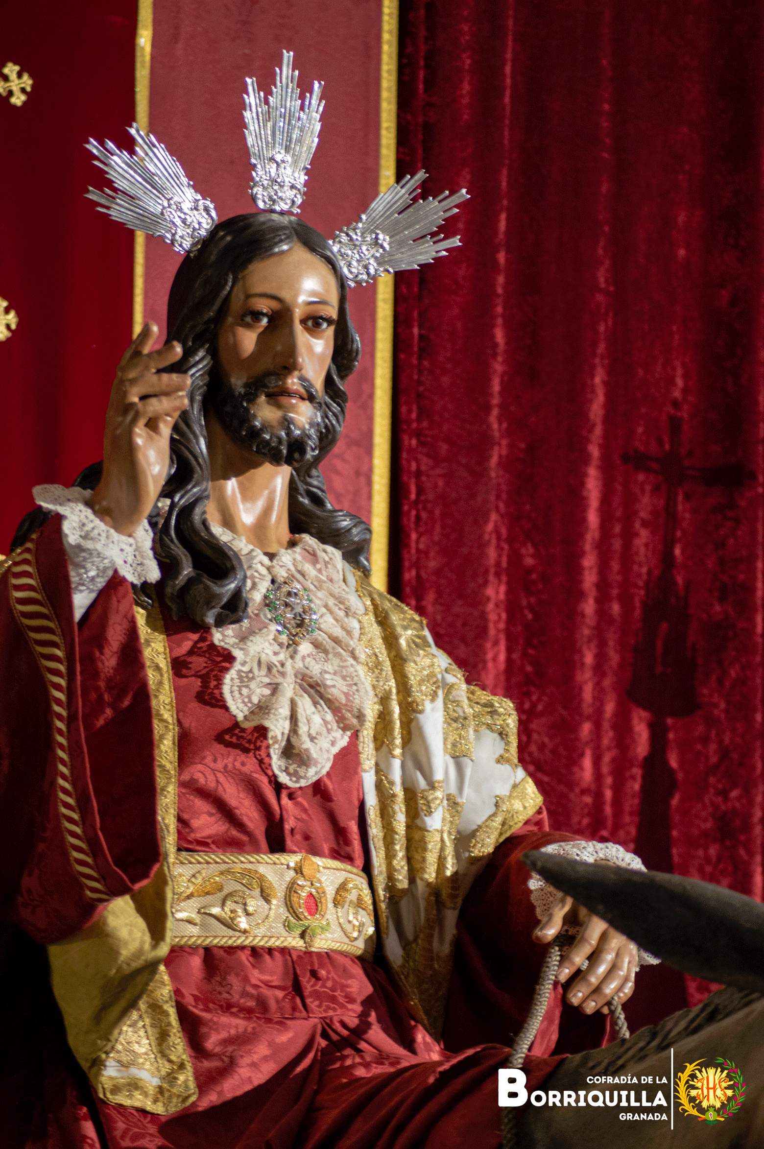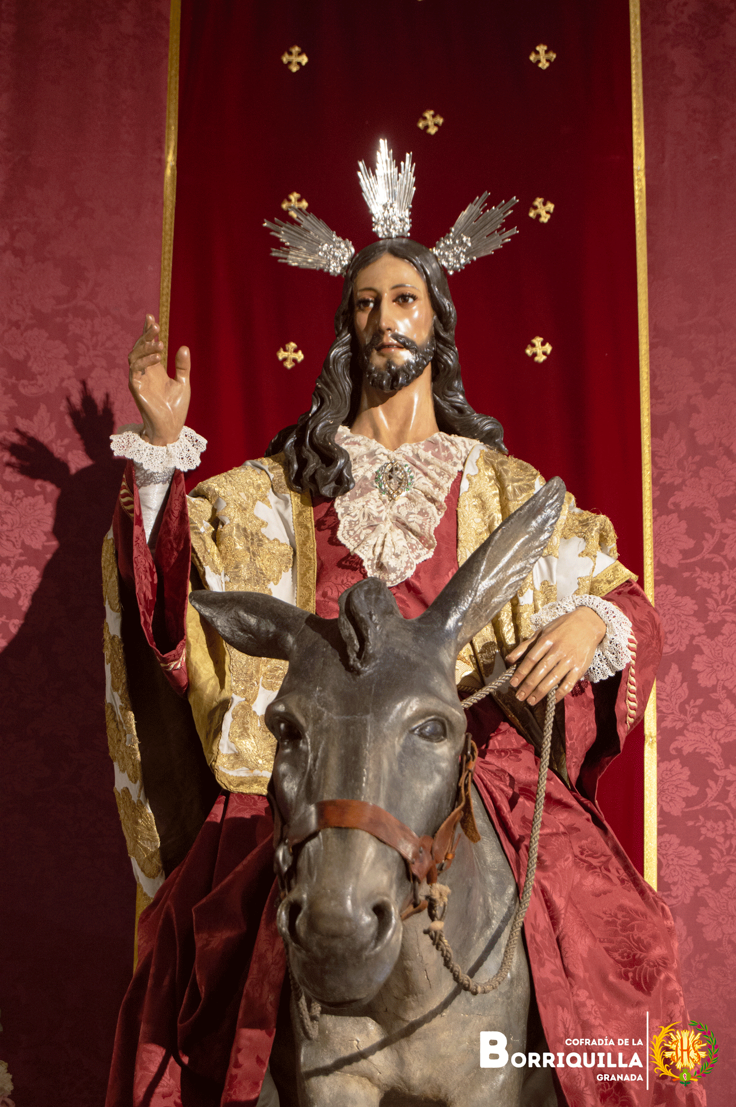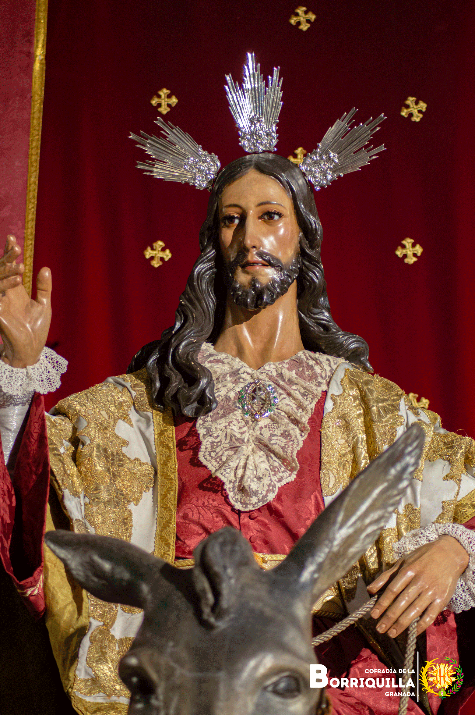 Jesús de la entrada en Jerusalén luce túnica de damasco rojo, mantolín blanco bordado en oro y las potencias de plata de 1917.