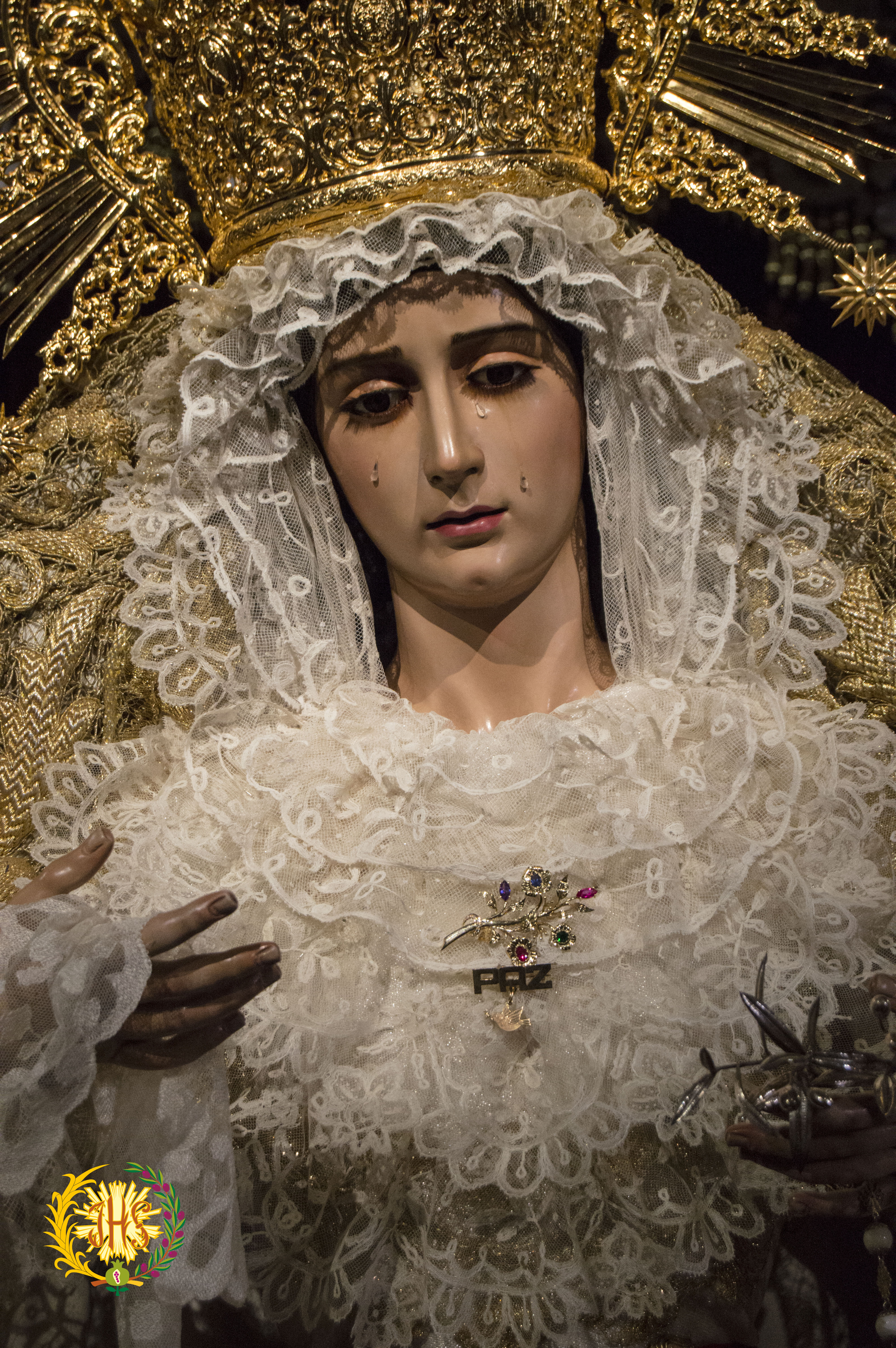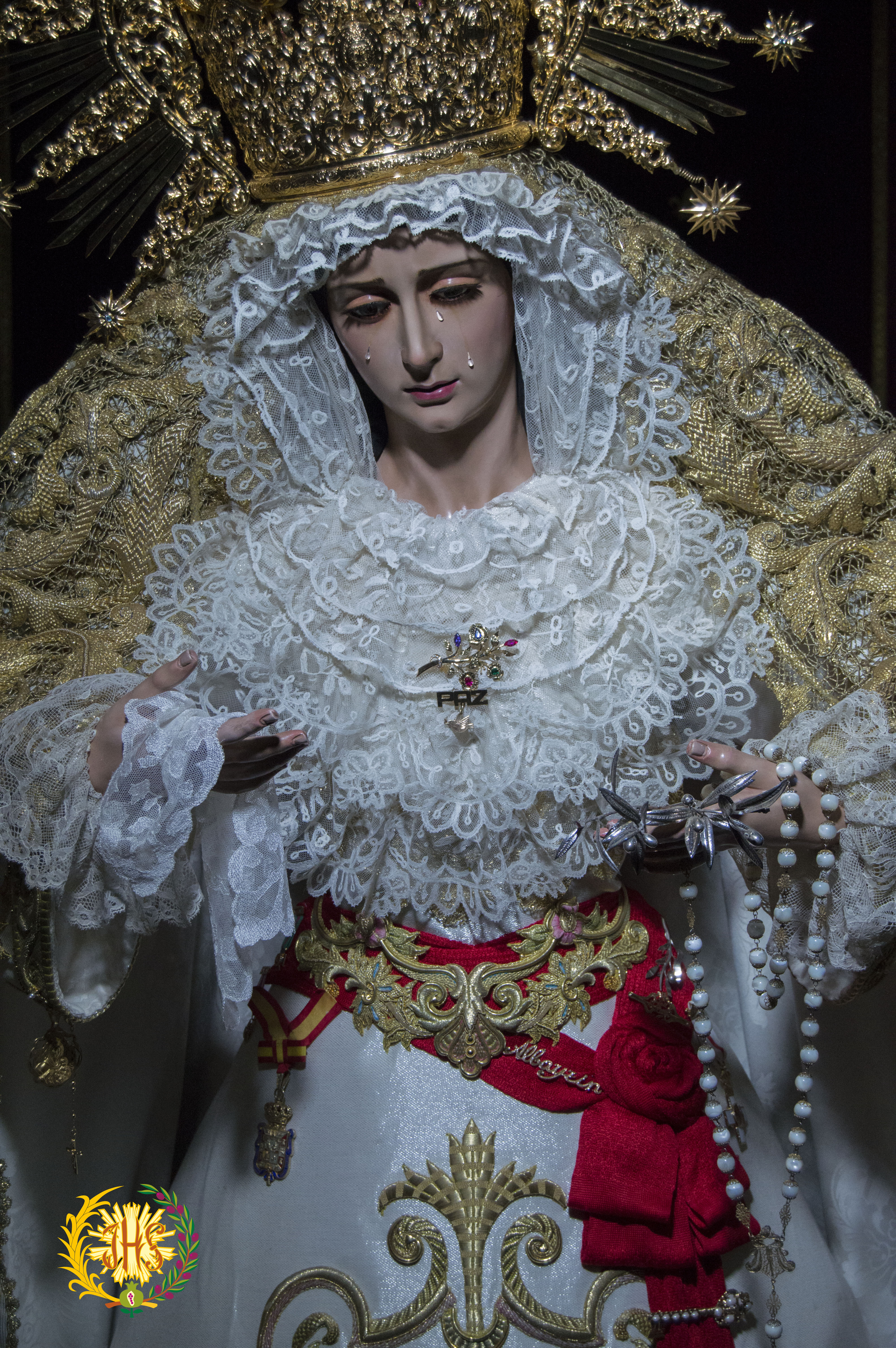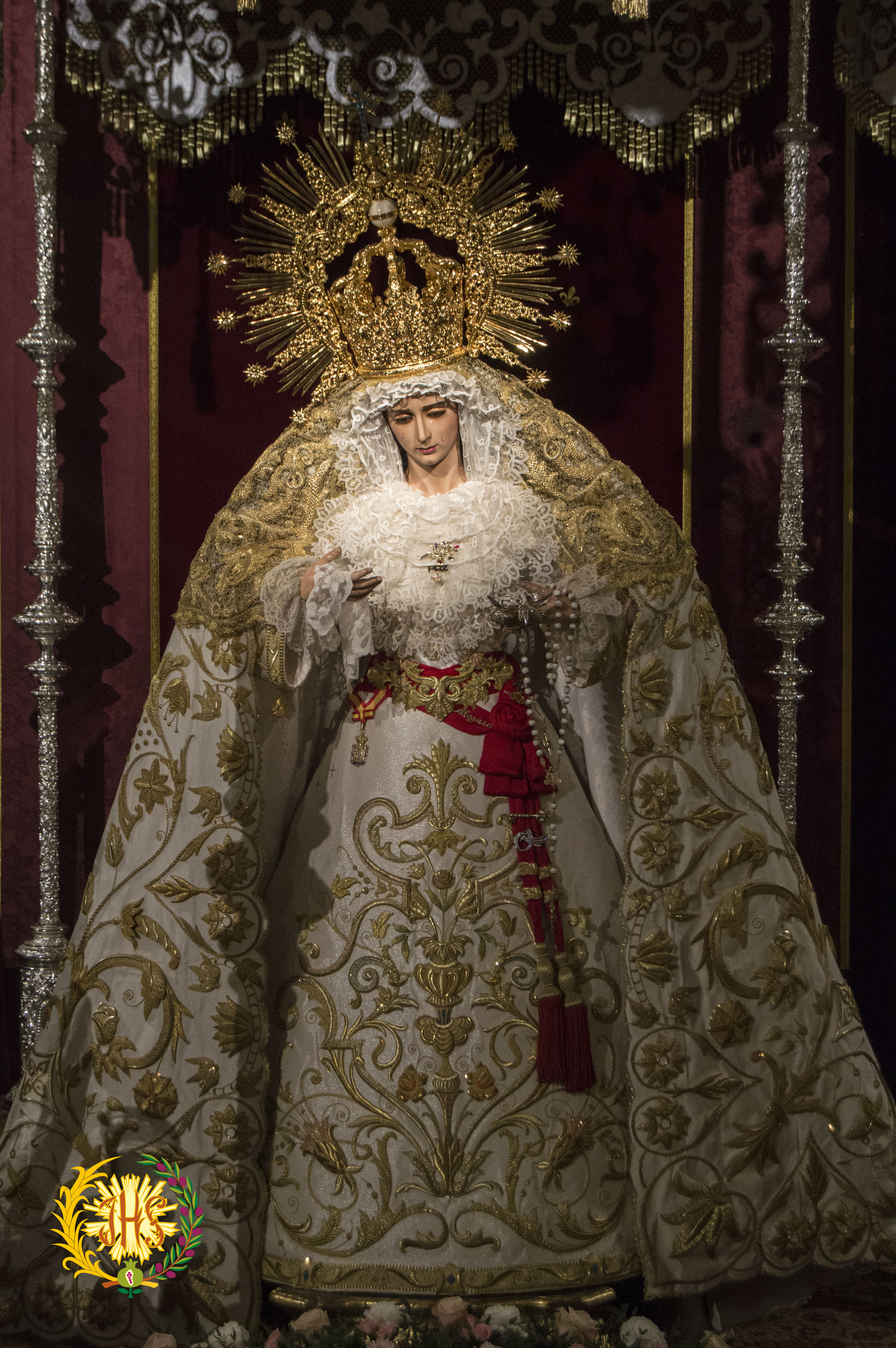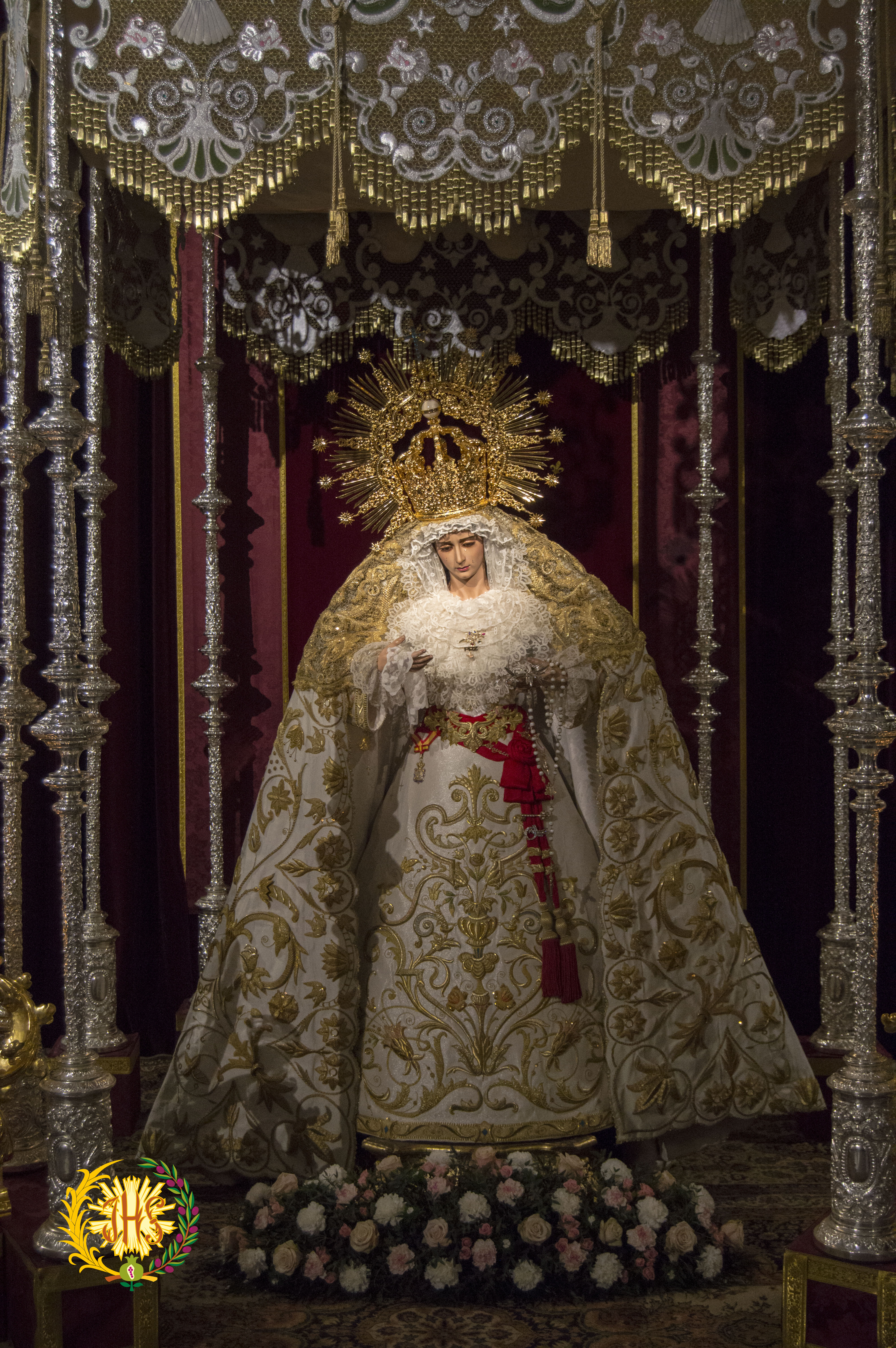 Luce saya bordada en oro sobre tisú de plata, manto bordado en oro cedido por la Hermandad de la Aurora (Granada) y corona de salida.