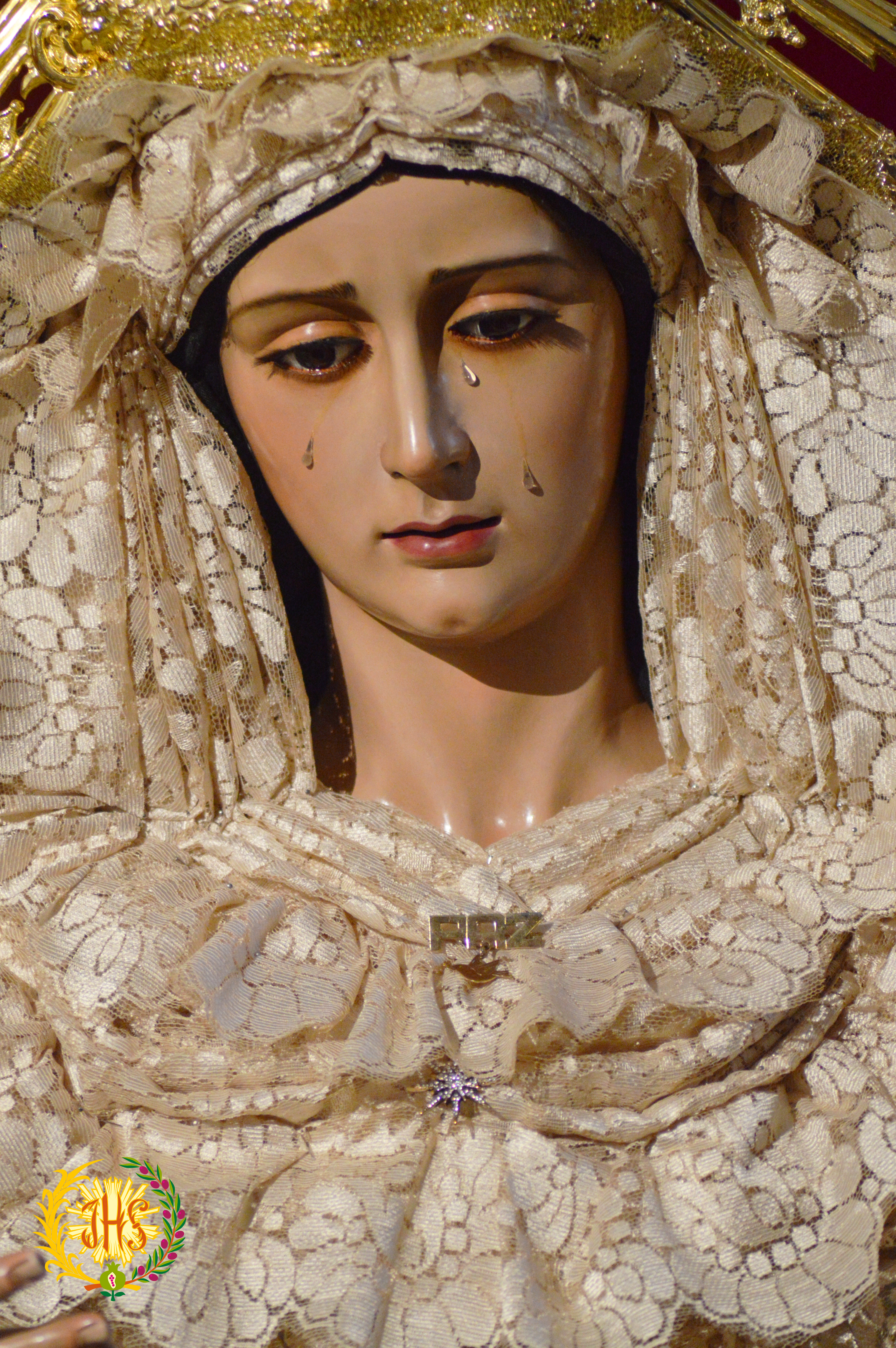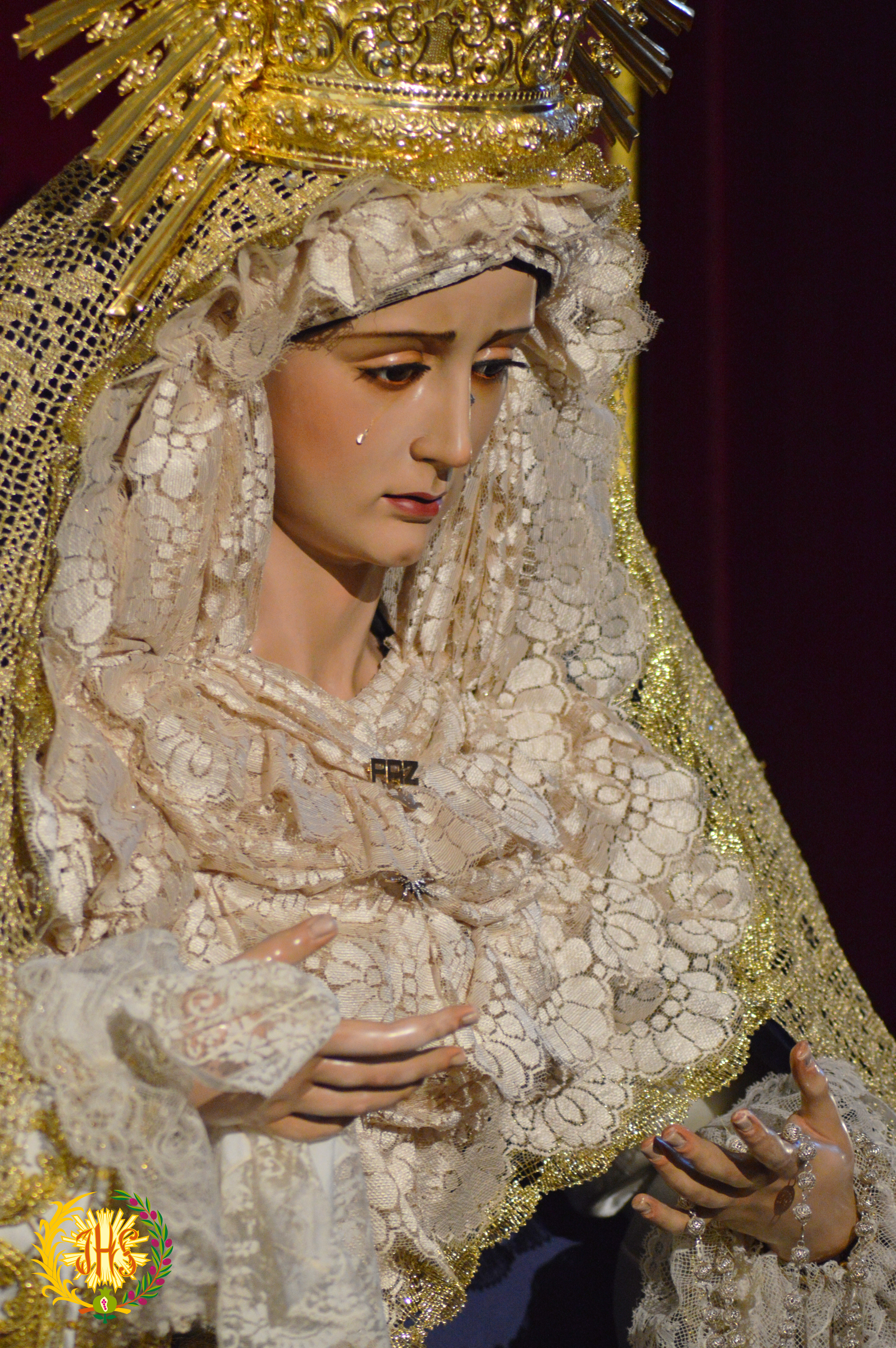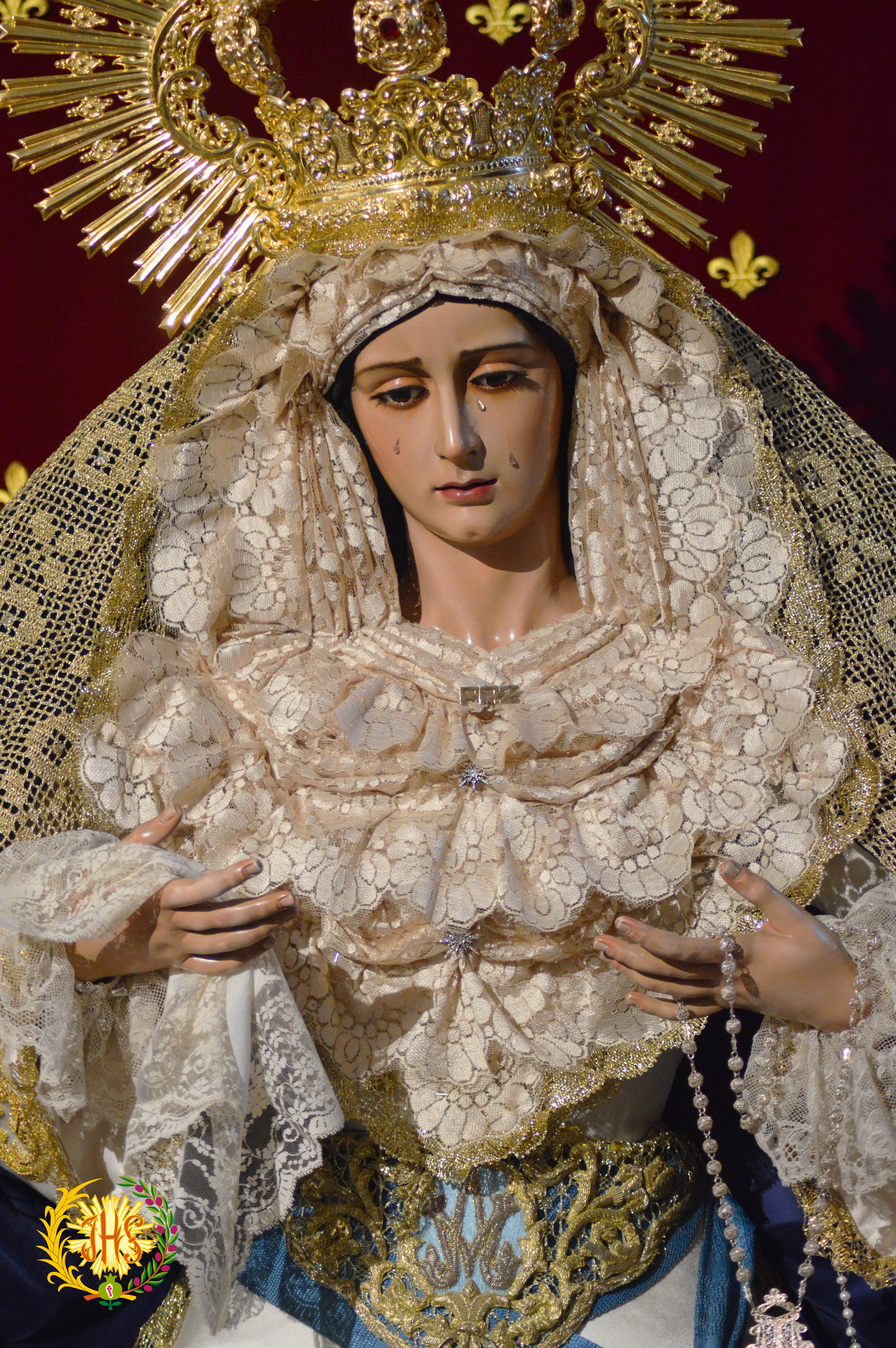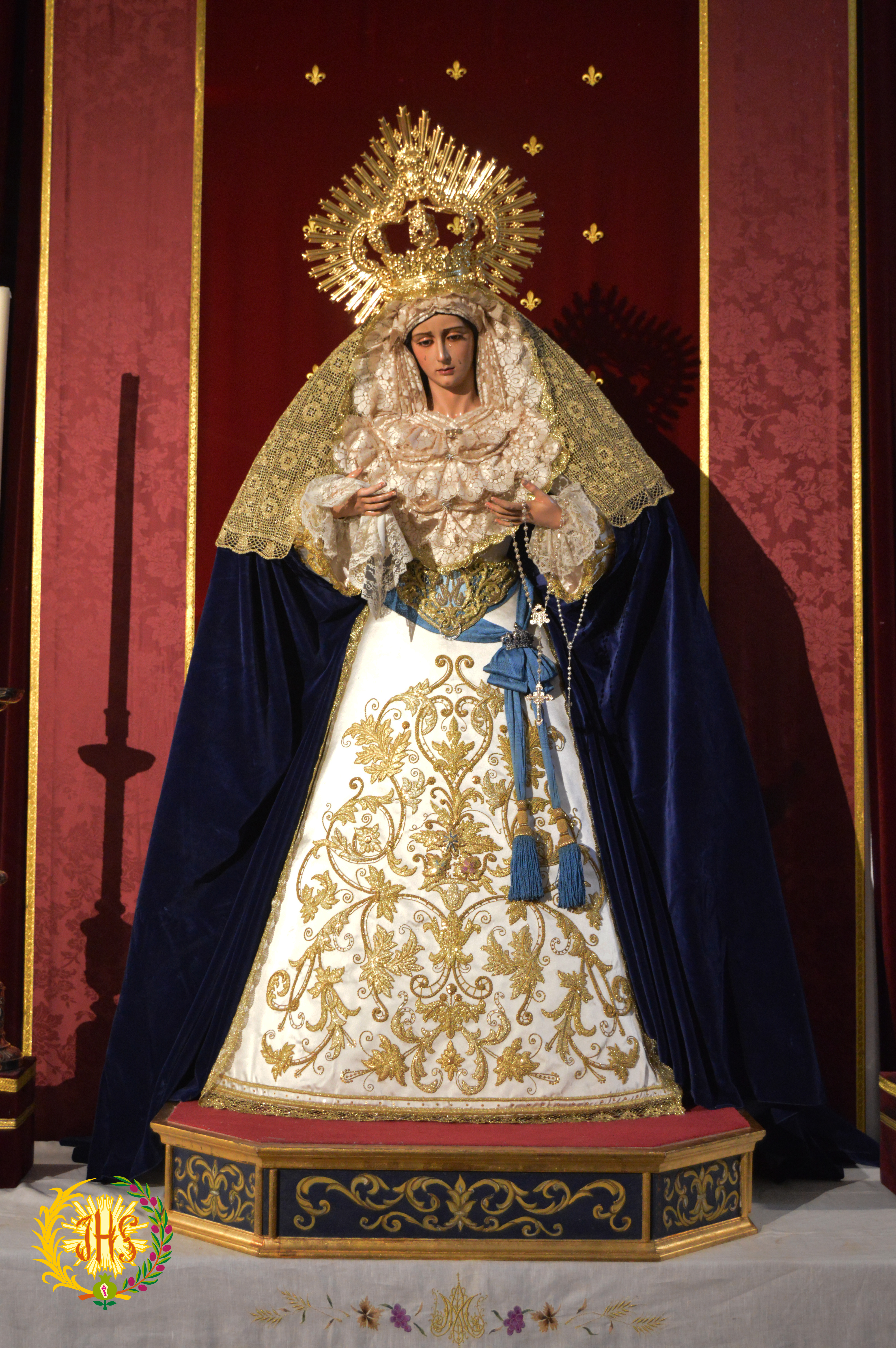 Luce saya bordada en oro a realce, manto azul pavo, toca de sobre manto elaborada con hilos dorados en técnica de bolillo y corona de capilla.