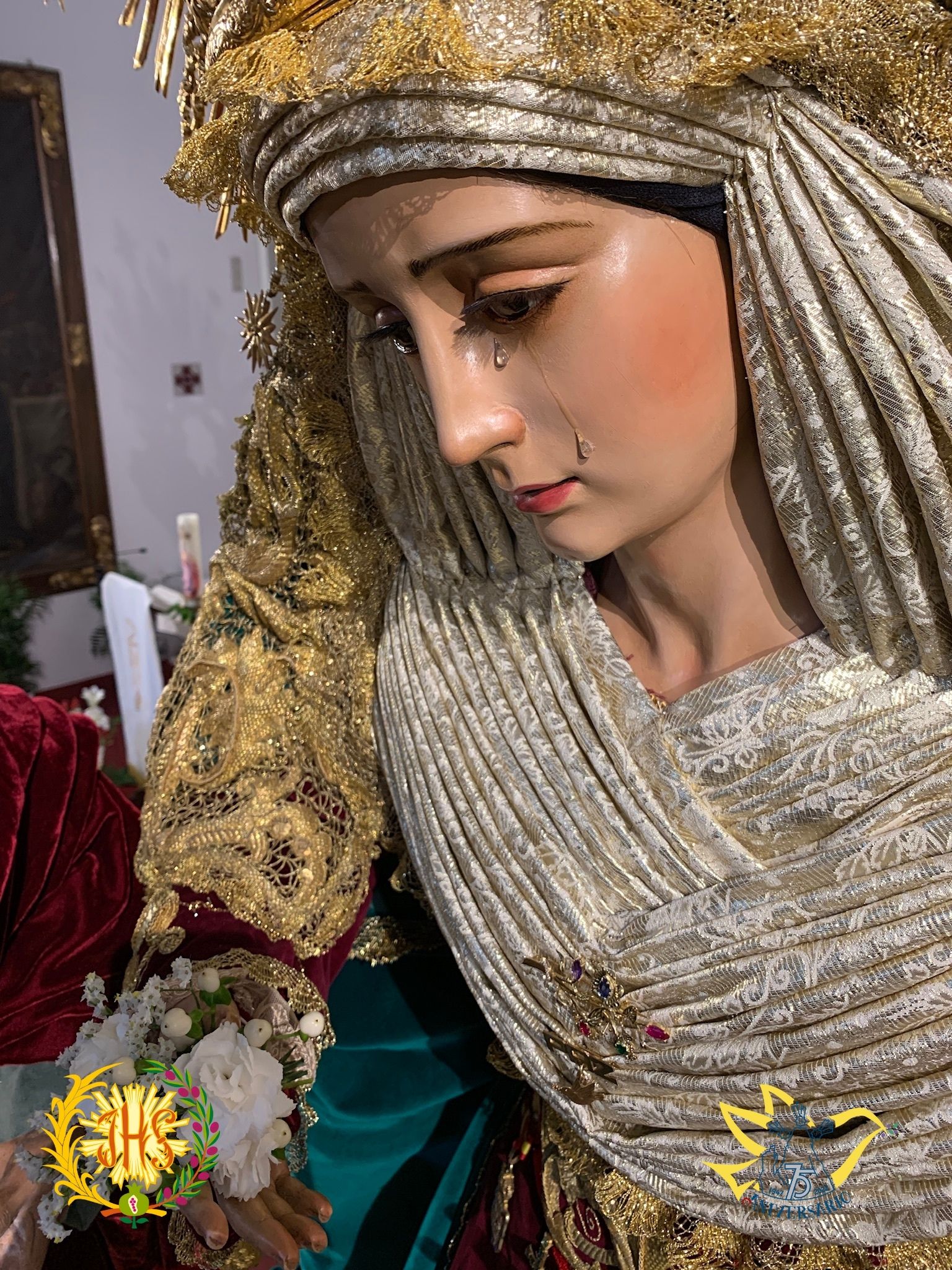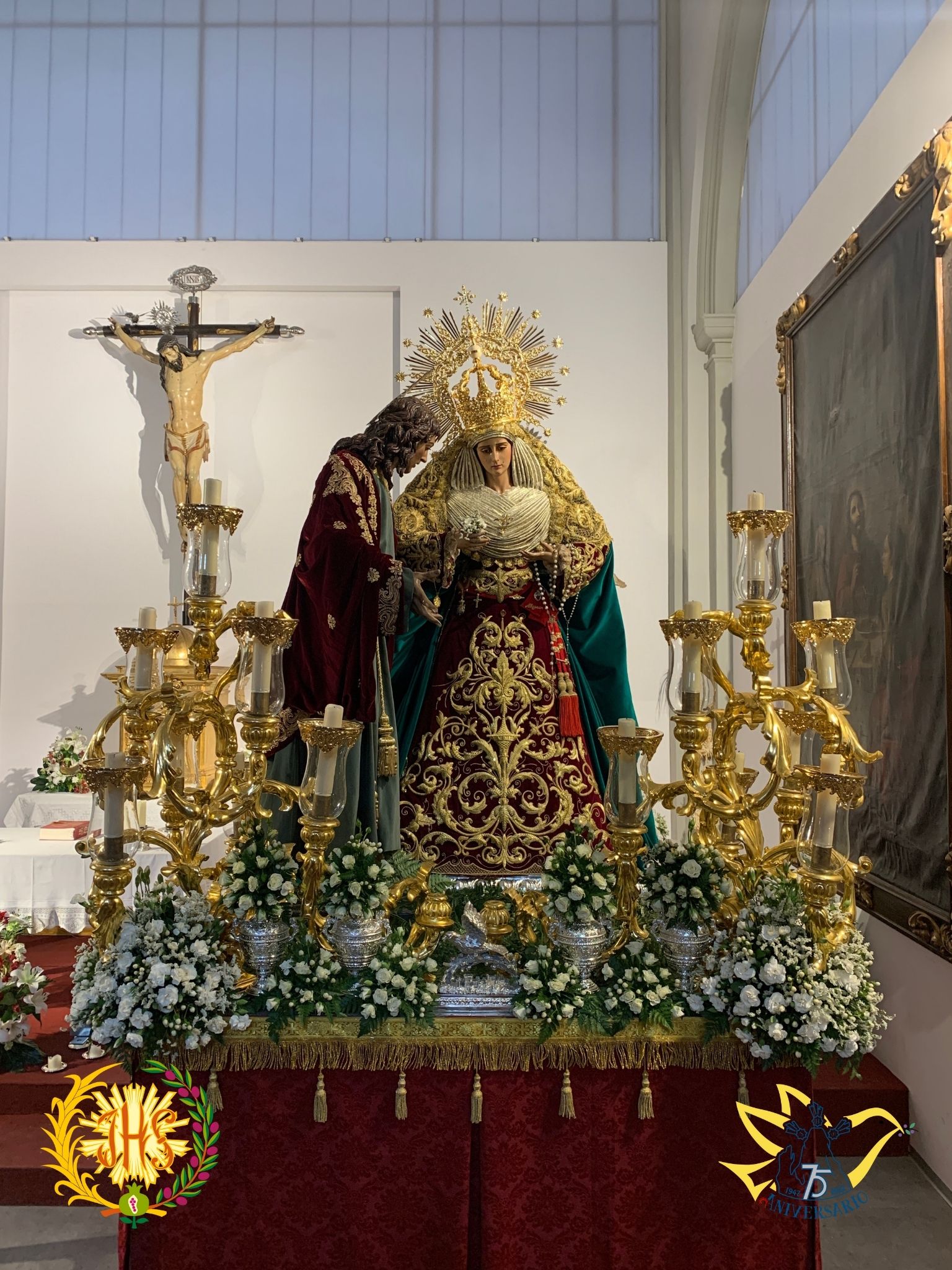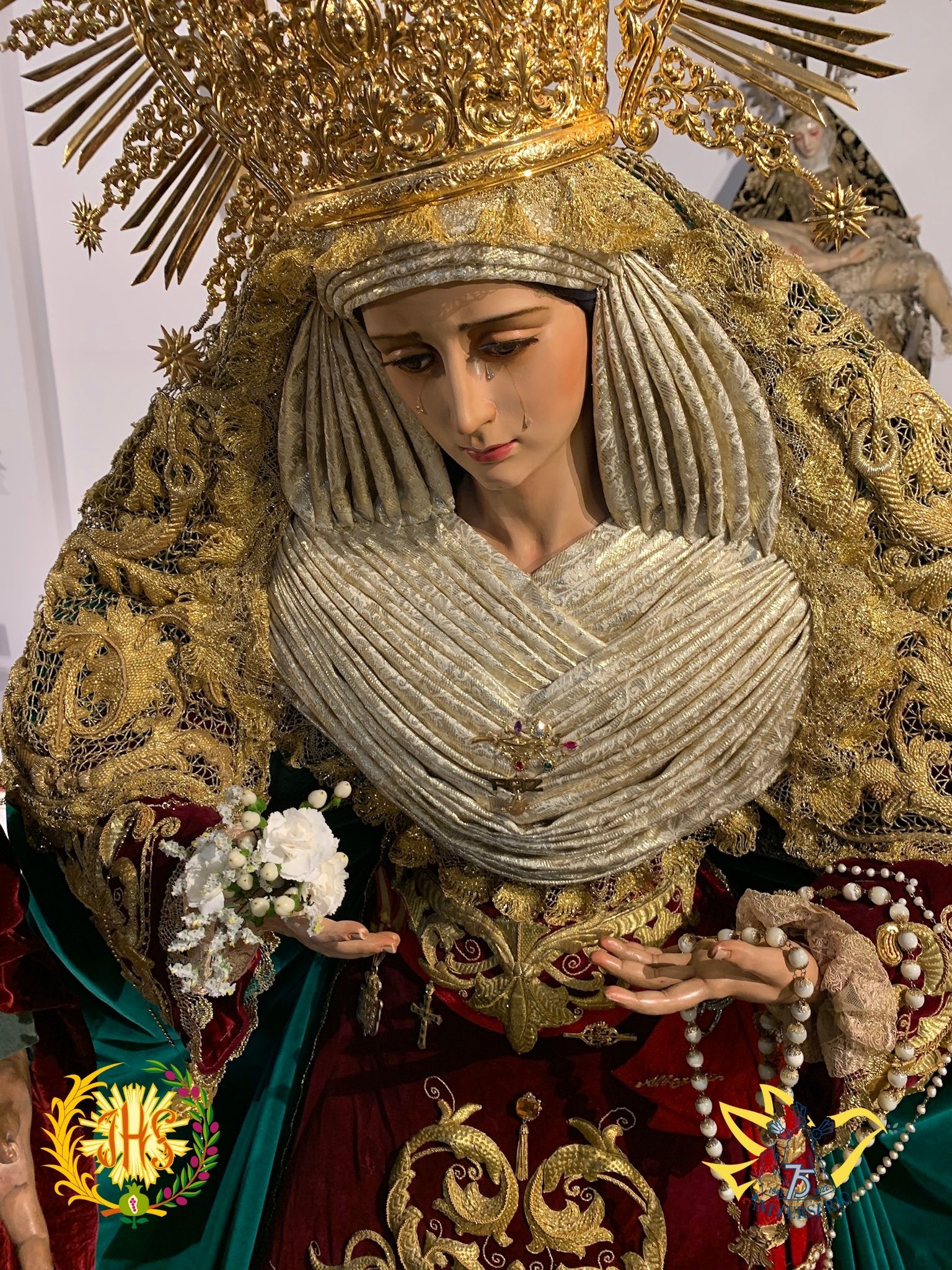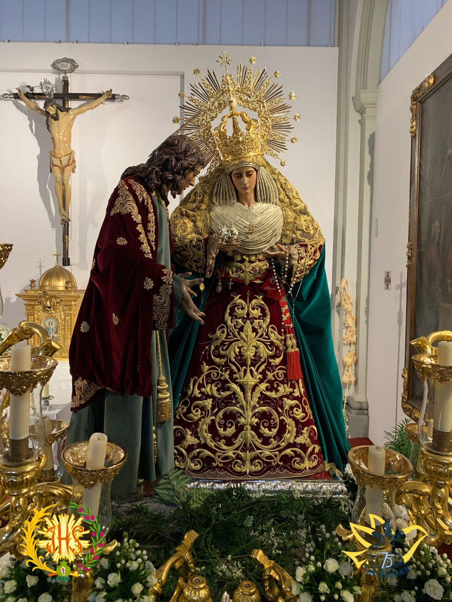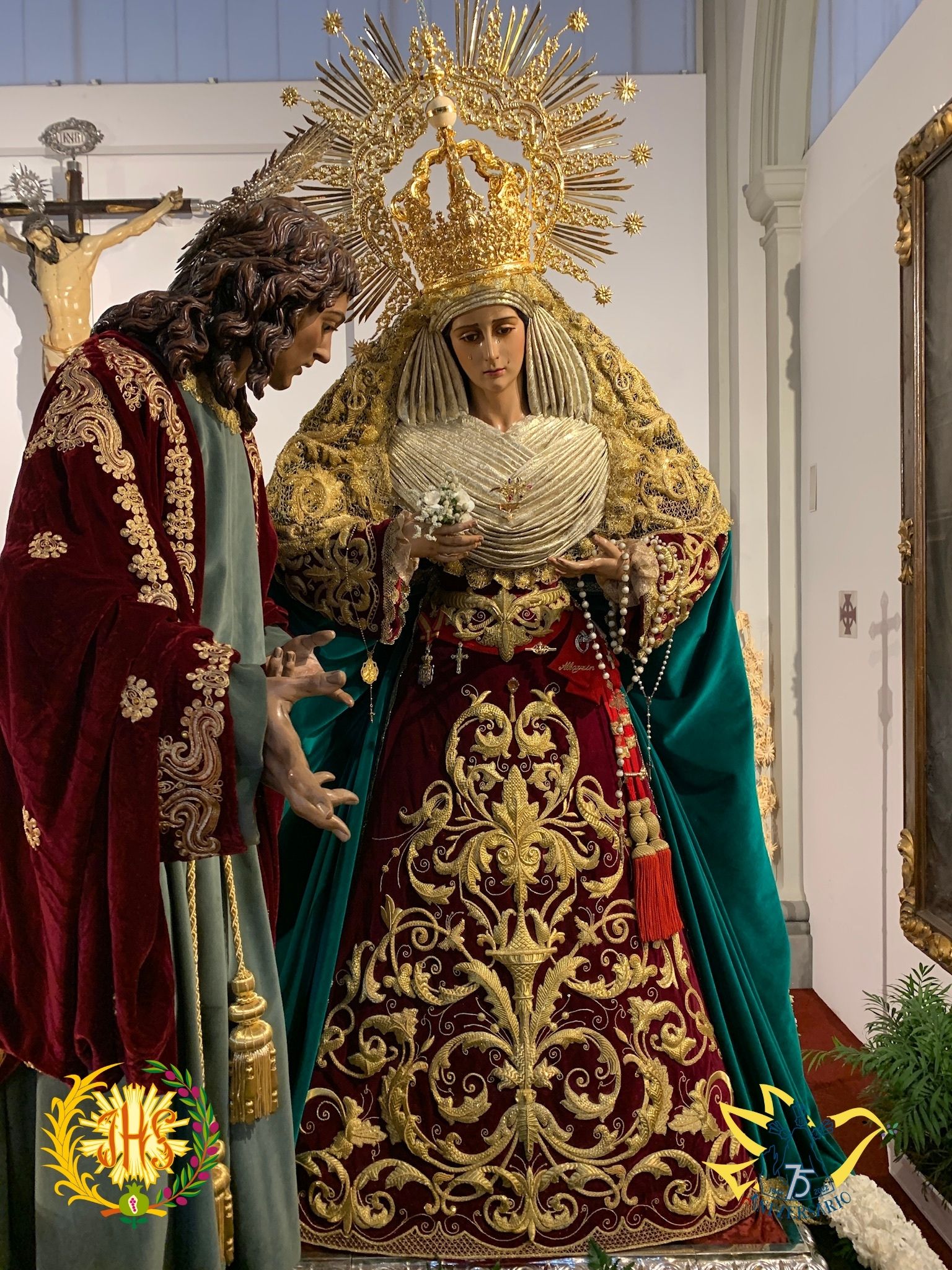 Luce saya bordada en oro sobre terciopelo burdeos, manto en terciopelo verde, toca de sobremanto bordada en oro y corona de salida.