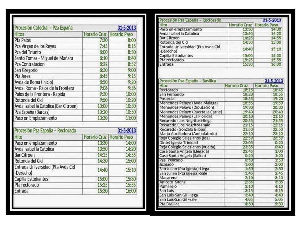 Se facilita el horario e itinerario que seguirá Nuestra Señora de la Esperanza Macarena en su salida extraordinaria el 31 de Mayo de 2014 a modo de guía para aquellos que han viajado a Sevilla con el autobús que ha organizado la Cofradía.