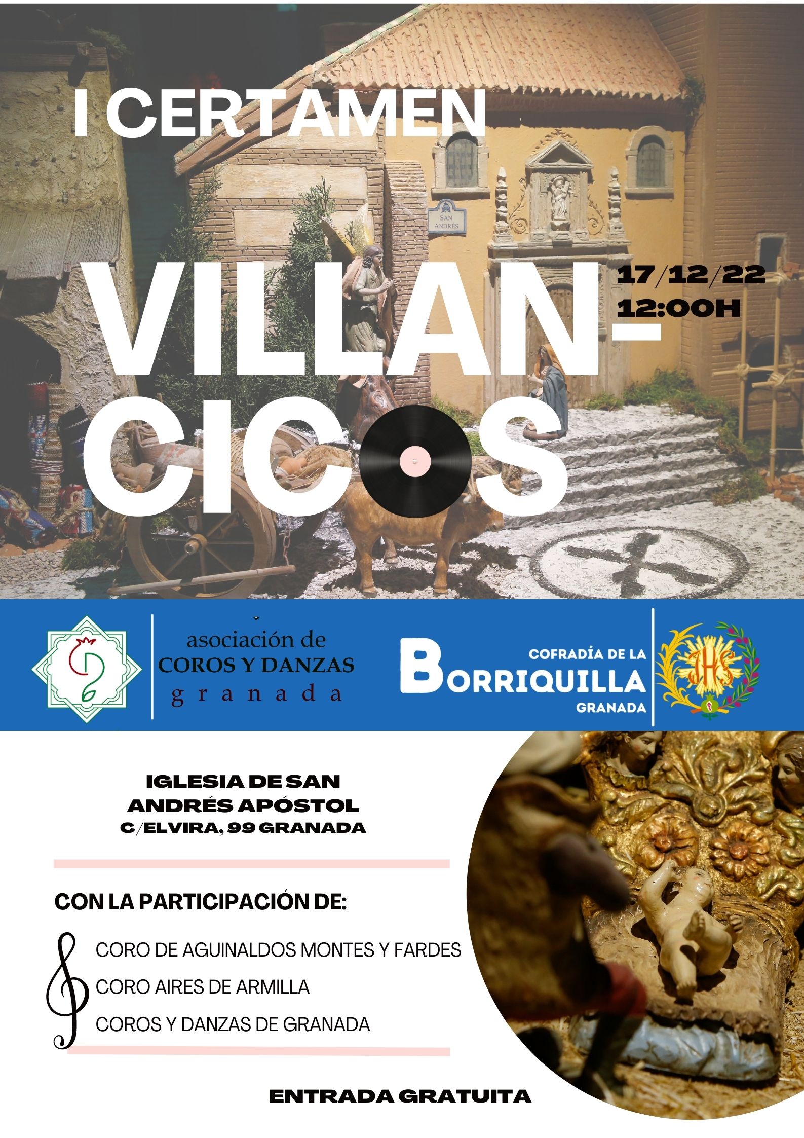 La Ilustre Cofradía de la Entrada de Jesús en Jerusalén y Ntra. Sra. de la Paz y la Asociación de Coros y Danzas de Granada tiene el gusto de invitaros al I Certamen de Villancicos el próximo sábado 17 de diciembre del 2022 a las 12h. en la Iglesia de San Andrés Apóstol.