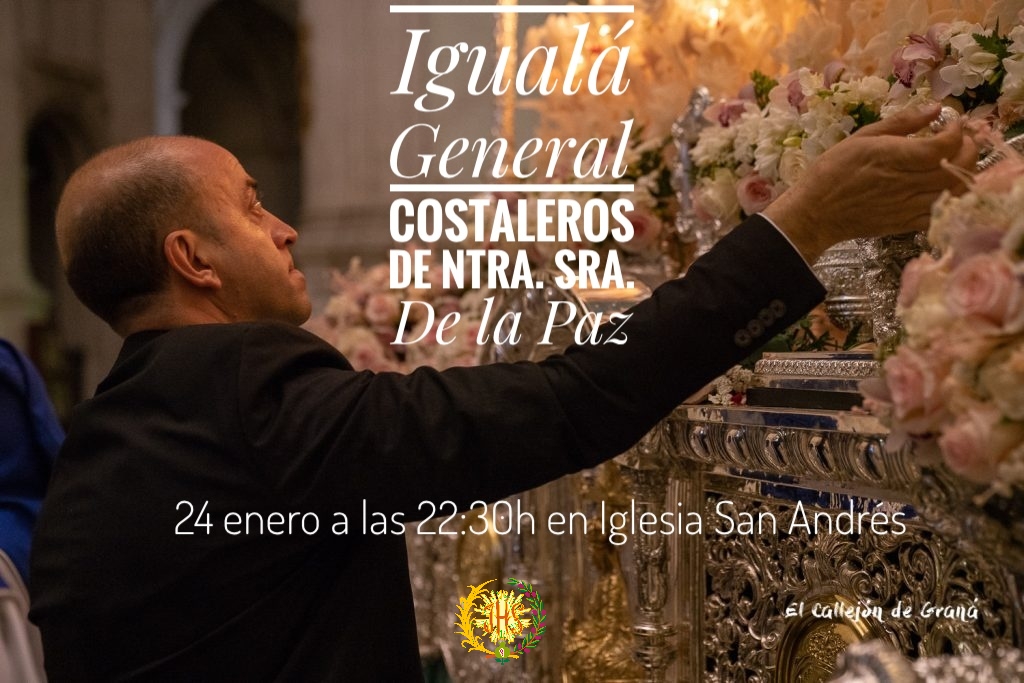 Informamos que el próximo viernes 24 de enero de 2020 se celebrará la primera Igualá General del Cuerpo de Costaleros de Nuestra Señora de la Paz, bajo la dirección del Capataz General Alberto Ortega García.