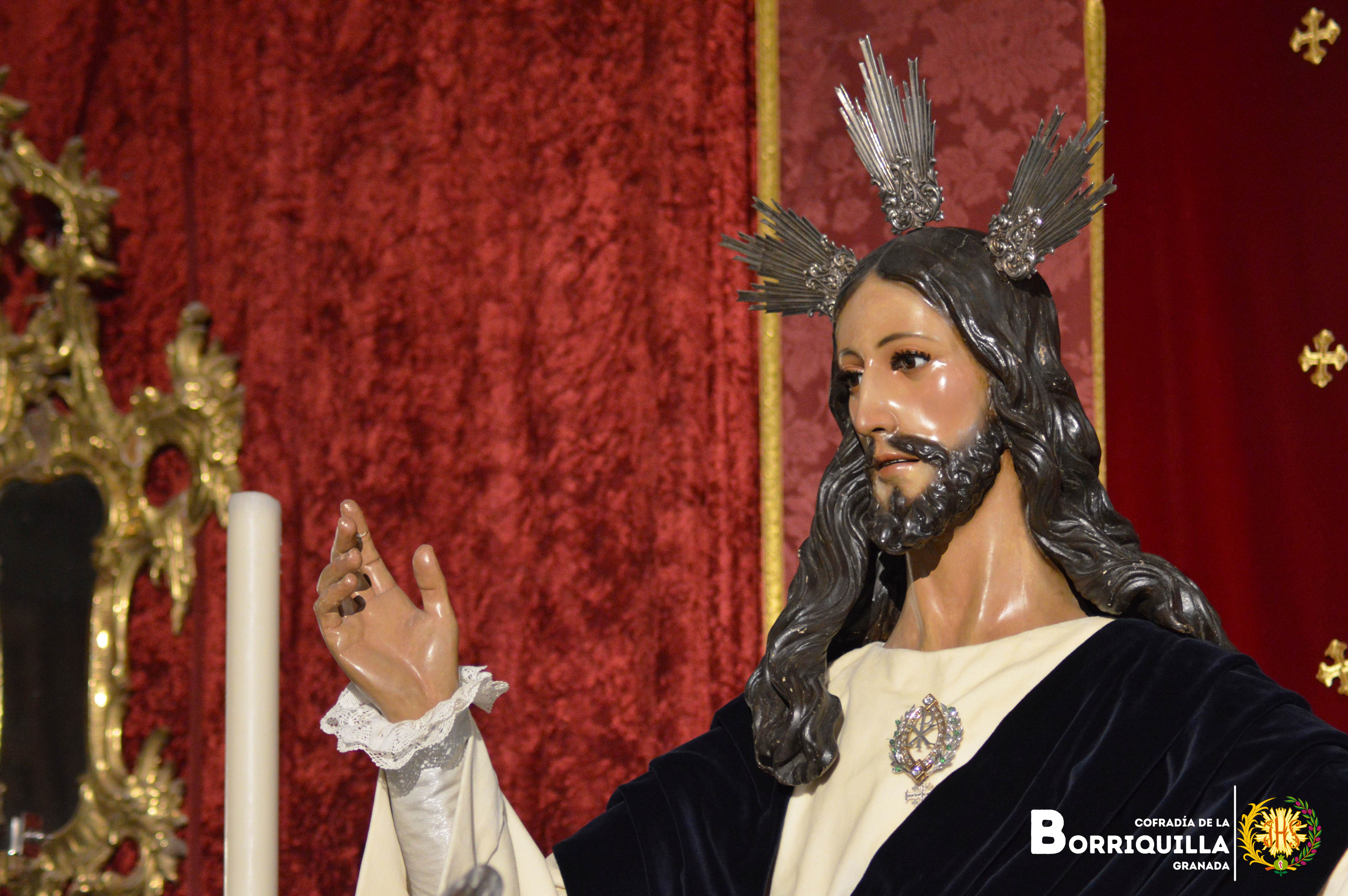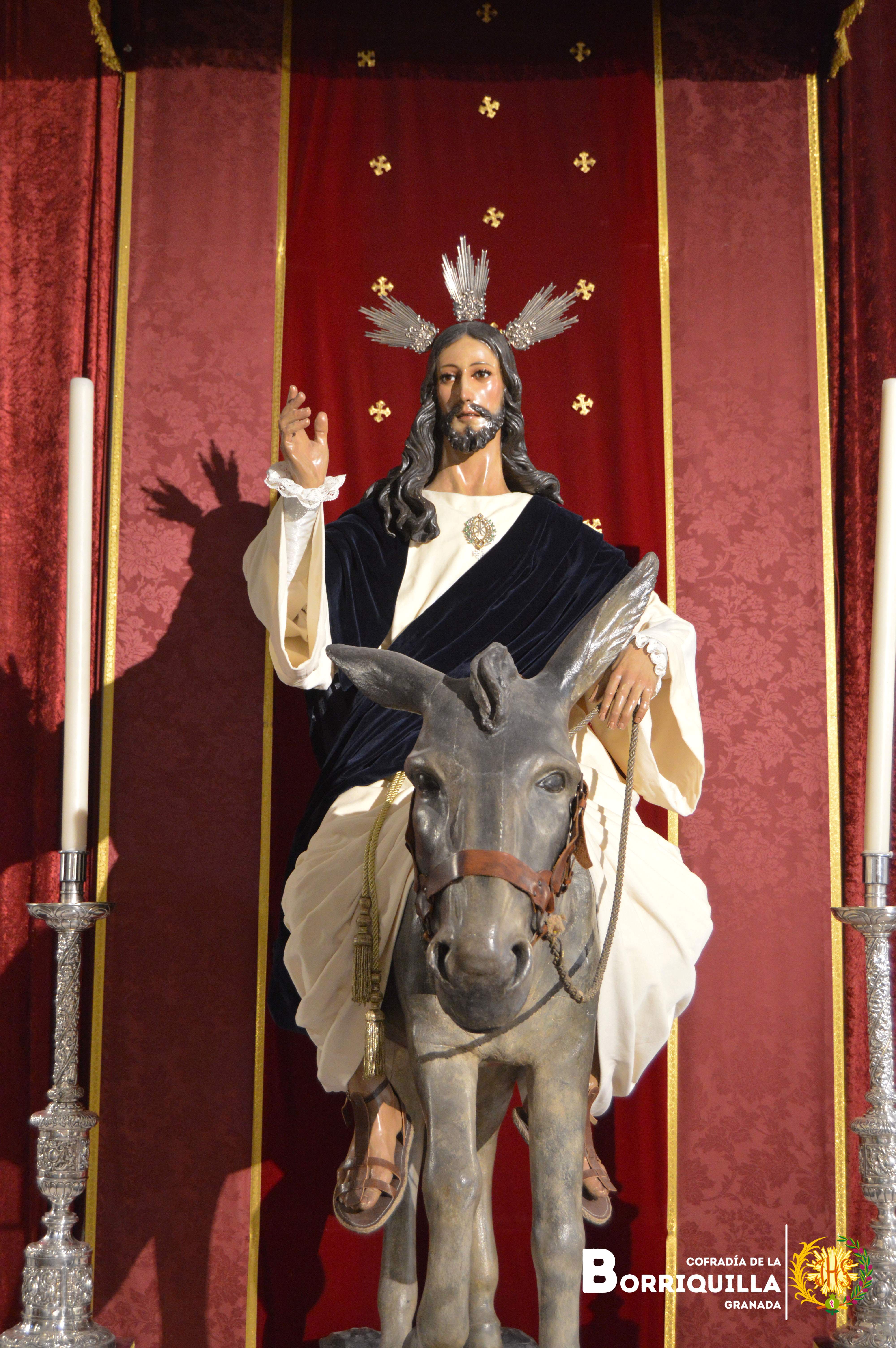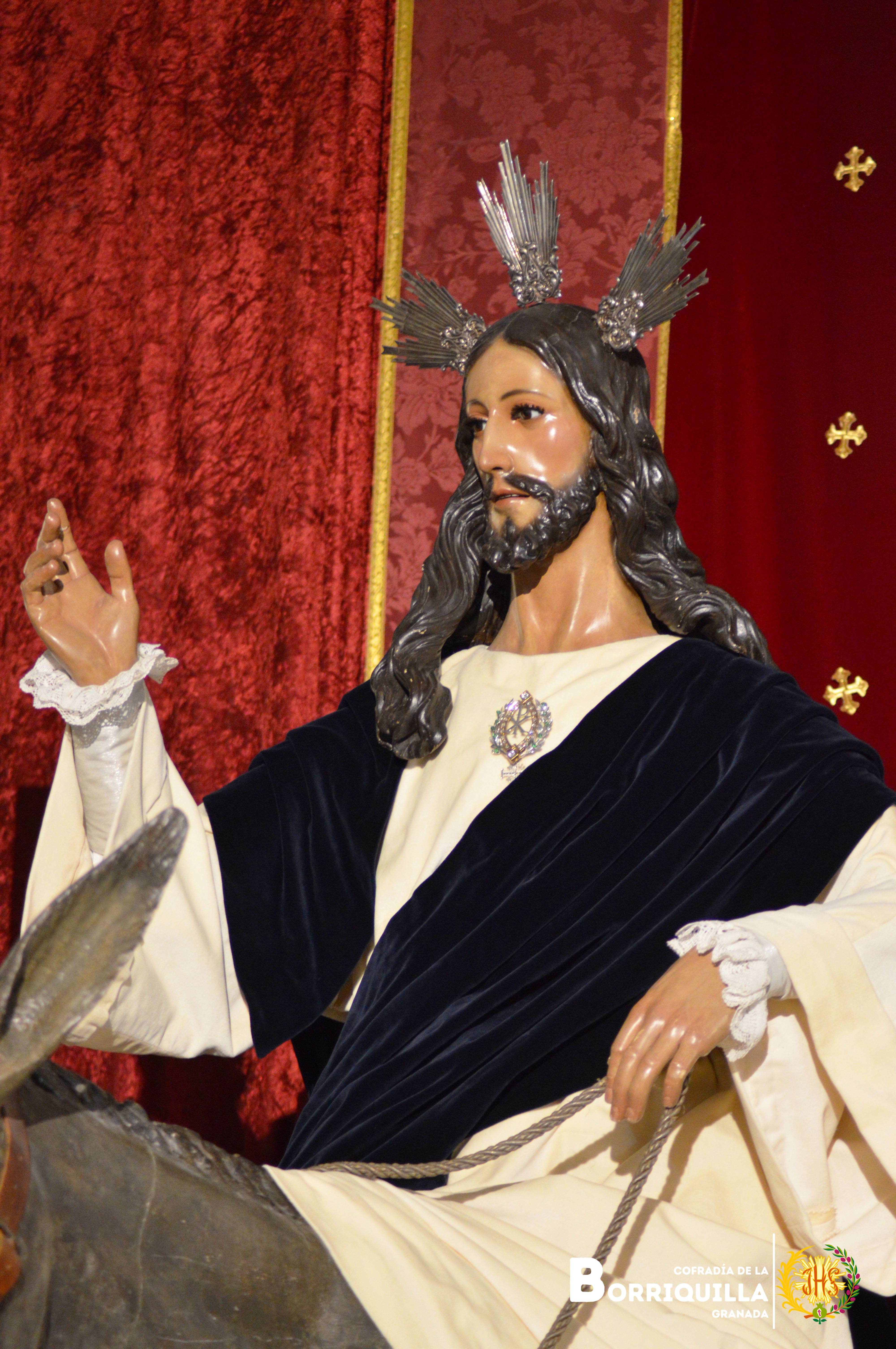 Así luce Jesús de la entrada en Jerusalén para el tiempo estival de este 2024. Para la ocasión, luce túnica en terciopelo crudo acompañada de un mantolín de terciopelo azul marino. Luce el broche con el crismón y las ramas de olivo, donado por el orfebre Miguel Ángel Montenegro y la cruz de Jerusalén, regalo traído desde tierra santa por un hermano de nuestra cofradía. Además, luce las potencias de plata de 1917. Todo esto dispuesto de manera maravillosa por N.H.D. Álvaro Caño González.