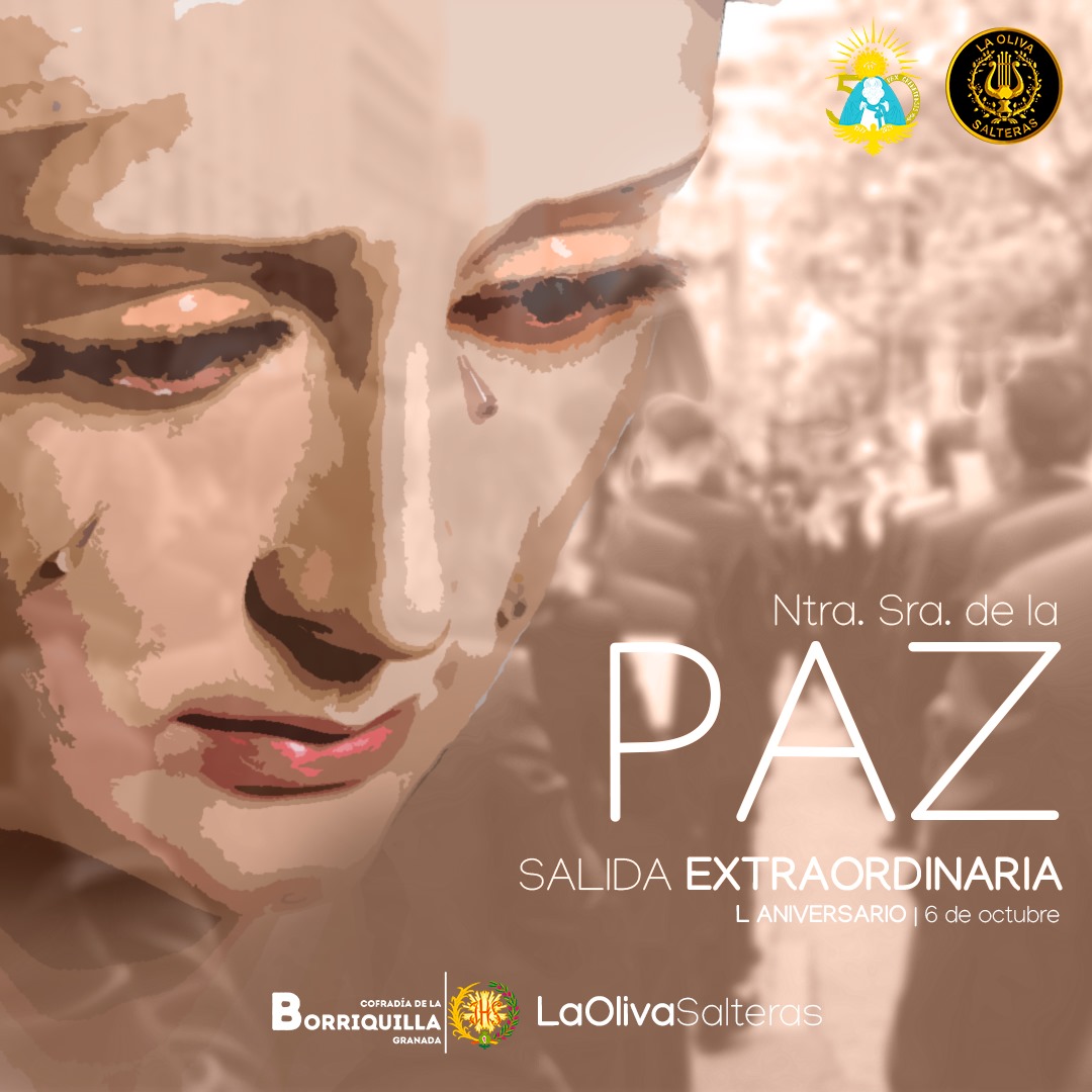 Ntra. Sra. de la Paz llegó a Granada hace 50 años de la mano del imaginero Dubé de Luque. La cofradía lleva inmersa en los actos conmemorativos desde Enero. Entre los actos previstos está la salida extraordinaria del 6 de Octubre desde la S.A.I. Catedral de Granada con los sones de la formación filarmónica “La Oliva de Salteras”.