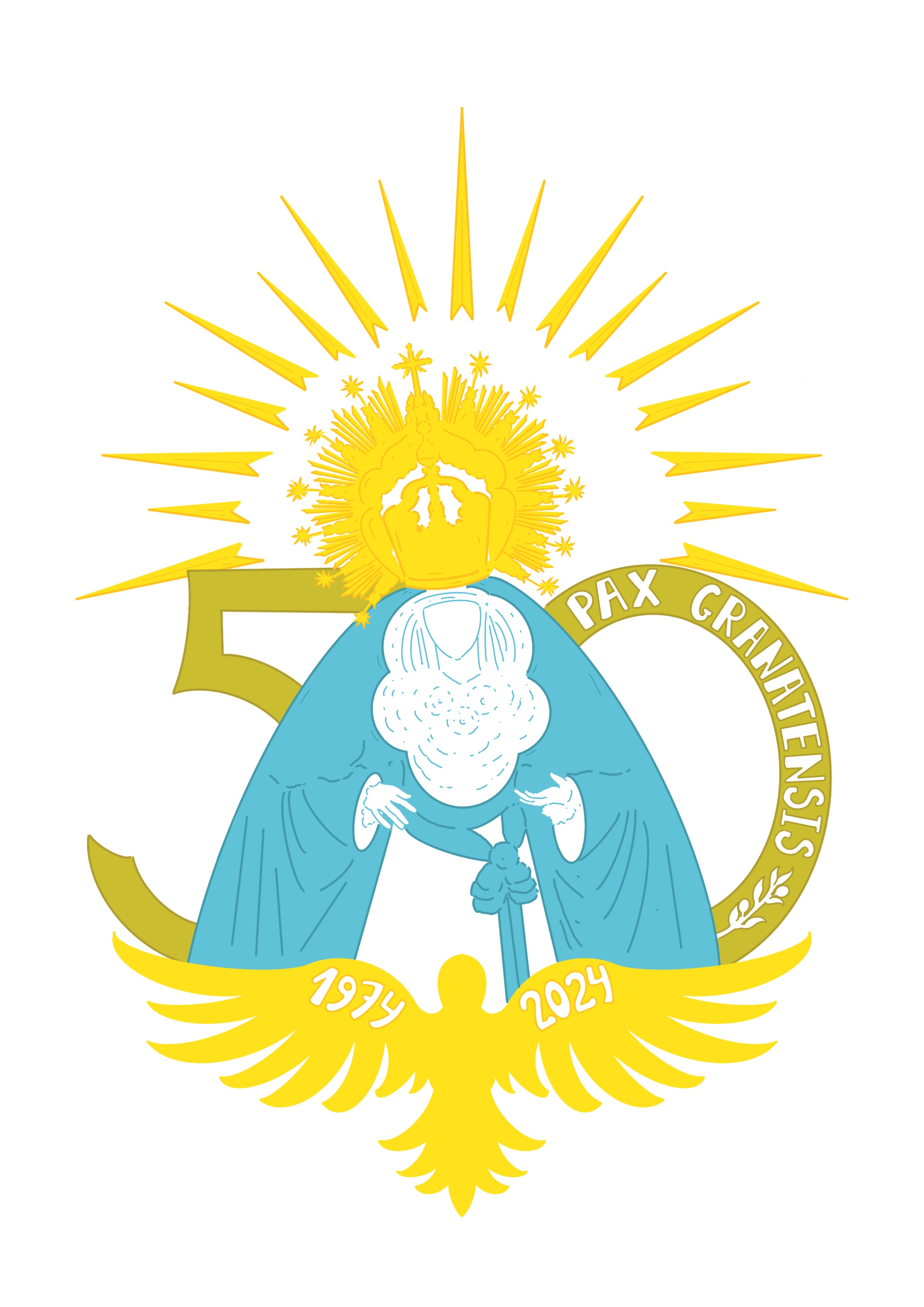Tras la imagen, aparece el numero 50 haciendo referencia a los años que se cumplen de su hechura y bendición, y en cuyo número O se observa la frase “PAX GRANATENSIS” que significa Paz de Granada junto a una rama de olivo.