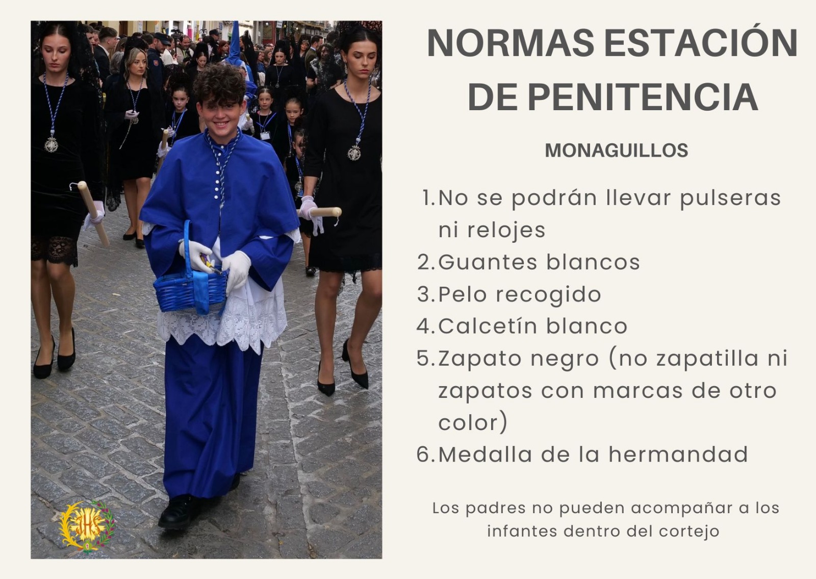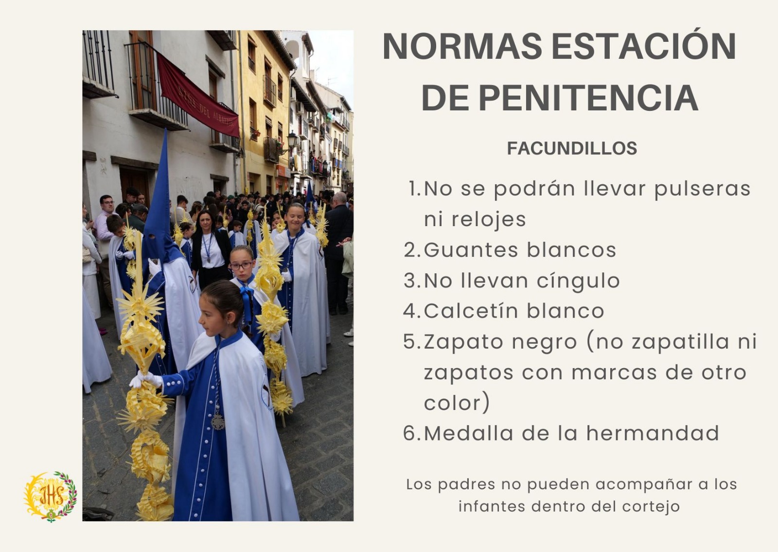 En este enlace puedes leerlas también con detalle https://www.borriquilla.es/normas-para-la-estacion-de-penitencia
