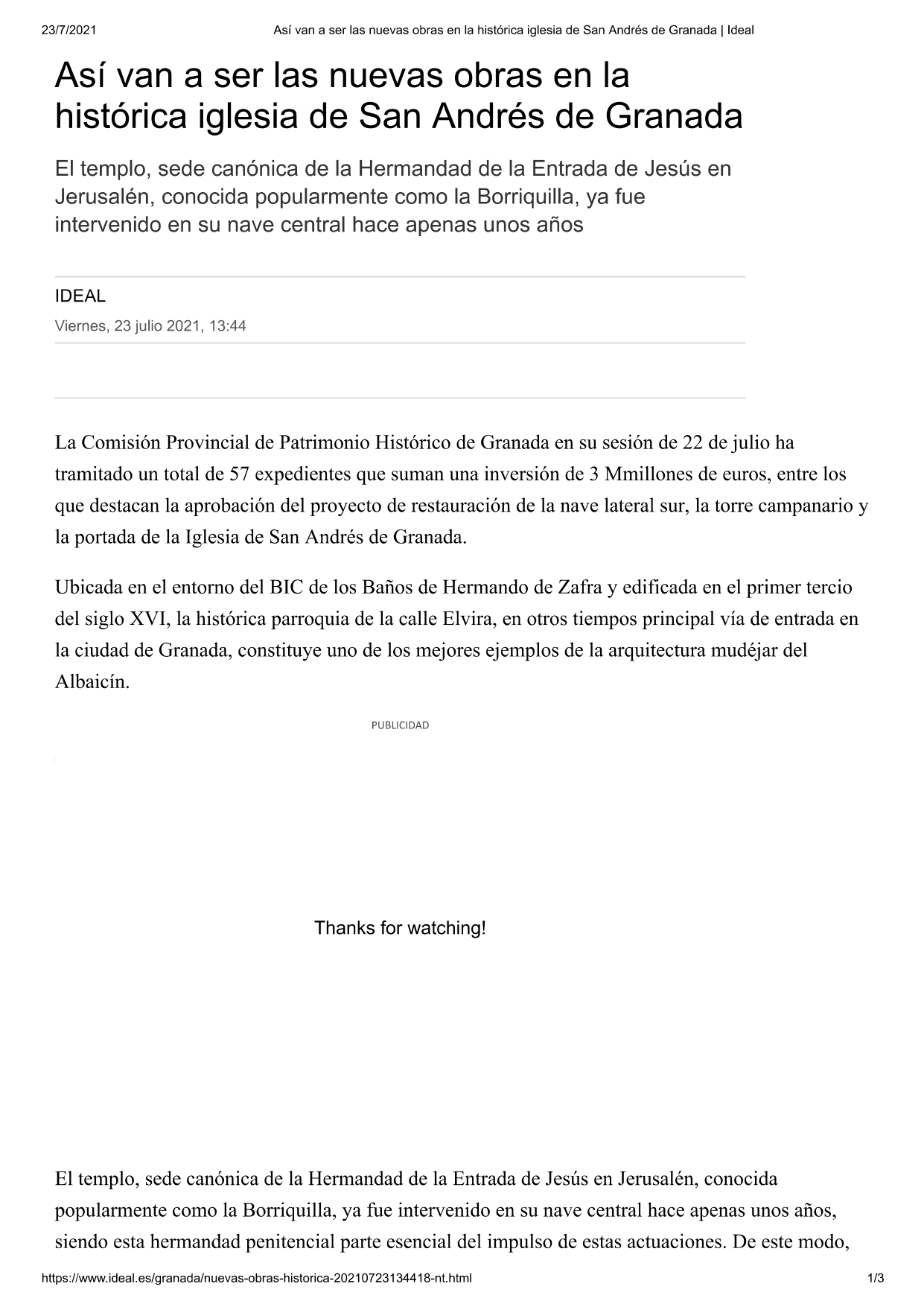 La Comisión Provincial de Patrimonio Histórico de Granada en su sesión de 22 de julio ha tramitado un total de 57 expedientes que suman una inversión de 3 Mmillones de euros, entre los que destacan la aprobación del proyecto de restauración de la nave lateral sur, la torre campanario y la portada de la Iglesia de San Andrés de Granada.