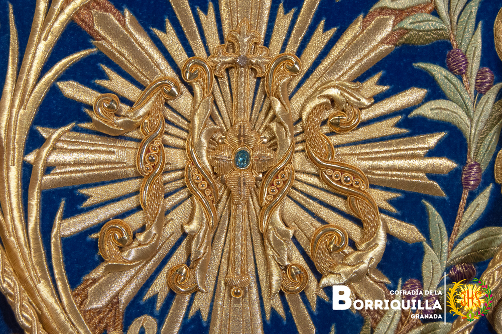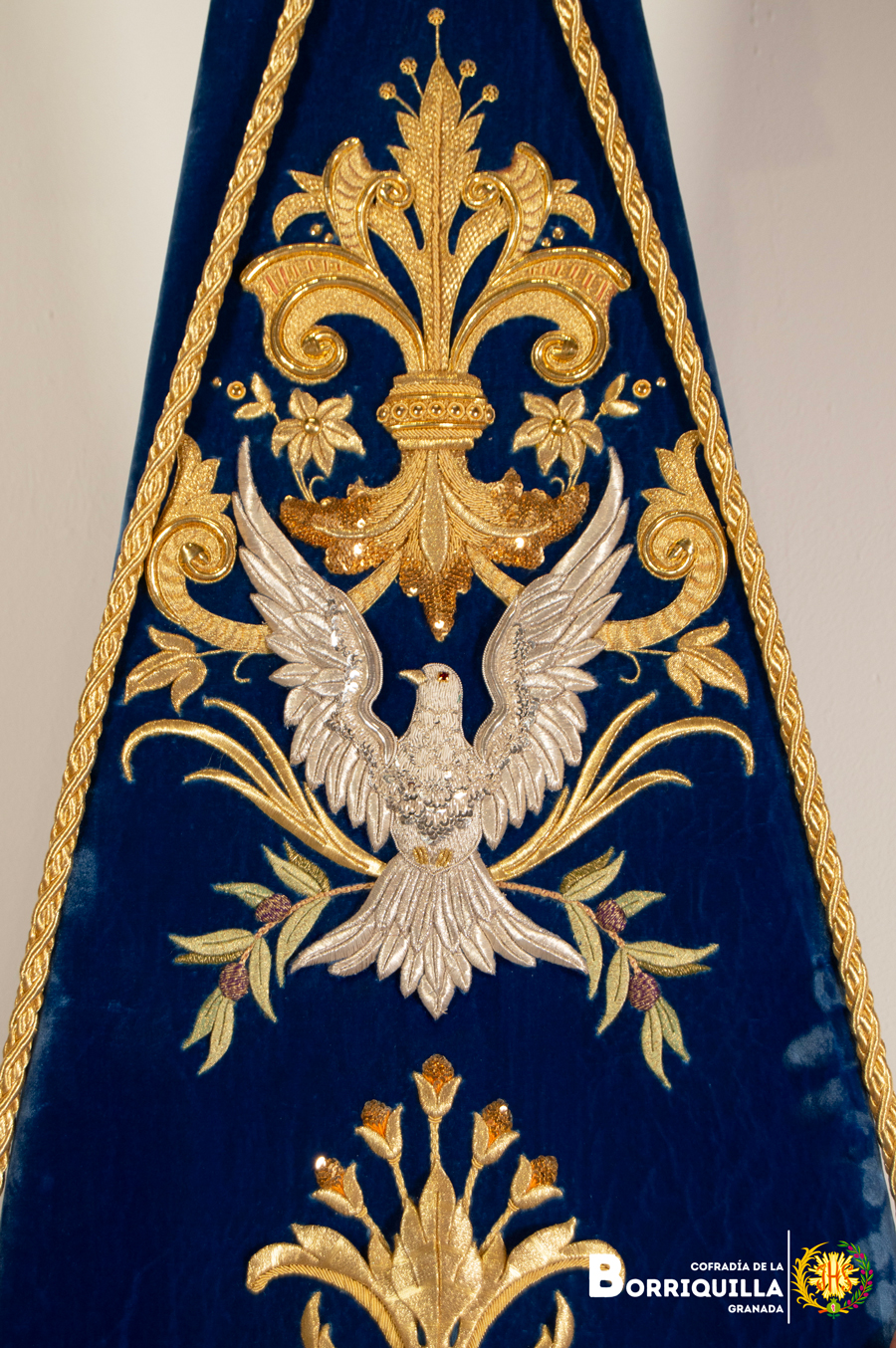 Este nuevo guion corporativo es una pieza de gran valor artístico y simbólico para la Cofradía. Una insignia que se lleva a todos los actos de la cofradía, preside nuestra estación de penitencia y custodia a nuestros sagrados titulares durante todo el año en nuestra iglesia parroquial. Según ha explicado Jose Manuel, se trata de un guión a bandera recogida, conocida popularmente como "Bacalao". Está bordado sobre terciopelo de seda azul cobalto de procedencia francesa, de excepcional calidad. Bordado en hilo de oro fino, plata fina, incrustaciones de pedrería, huevecillos de plata dorada y seda. Esta ejecutado con bordados al realce. Su diseño de corte clásico, barroco, integra motivos arquitectónicos y vegetales que enmarcan el escudo de la Cofradía, la pieza más elaborada de todo el diseño. Dicho escudo se presenta sobre un sol resplandeciente con el anagrama de Cristo Salvador, realizados con hilos de diferentes calibres y brillos, rodeado por una rama de olivo trabajada en hilos de colores, torciendo los hilos a mano, con hilo de seda y oro, y una palma triunfal unida en la base por una Granada. Además, bajo el escudo se ha incorporado la cruz aspada de San Andrés, en honor al titular de nuestra parroquia. En la parte superior, se puede observar una paloma, en honor a Ntra. Sra. de la Paz. En la parte inferior, se observa una gran jarra de flores, representativo de la primavera, del Domingo de Ramos, todo vuelve a renacer con la primera cofradía en la calle. El conjunto se anuda con un cíngulo de oro rematado en borlas realizadas a mano, aportando majestuosidad y elegancia.