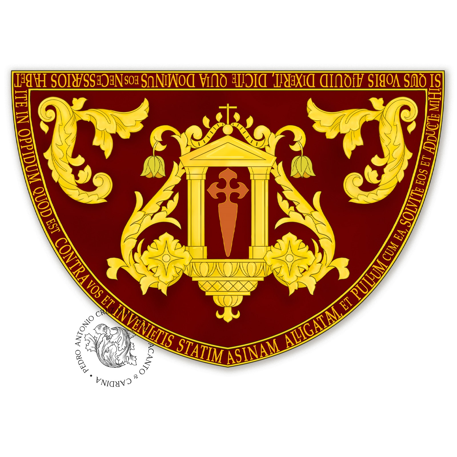 Estos paños serán bordados en oro a realce sobre terciopelo burdeos, aportando elegancia y solemnidad al conjunto.