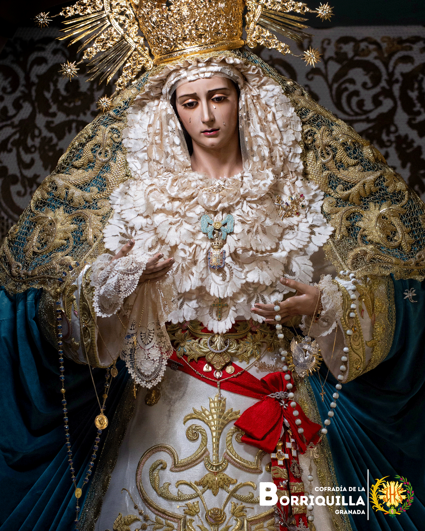 Ntra. Sra. de la Paz luce terno de salida, compuesto por saya bordada en hilos de oro y sedas sobre tisú de plata, manto de terciopelo verdeagua y corona de plata sobredorada. Además, estrena encaje de blonda de seda española.