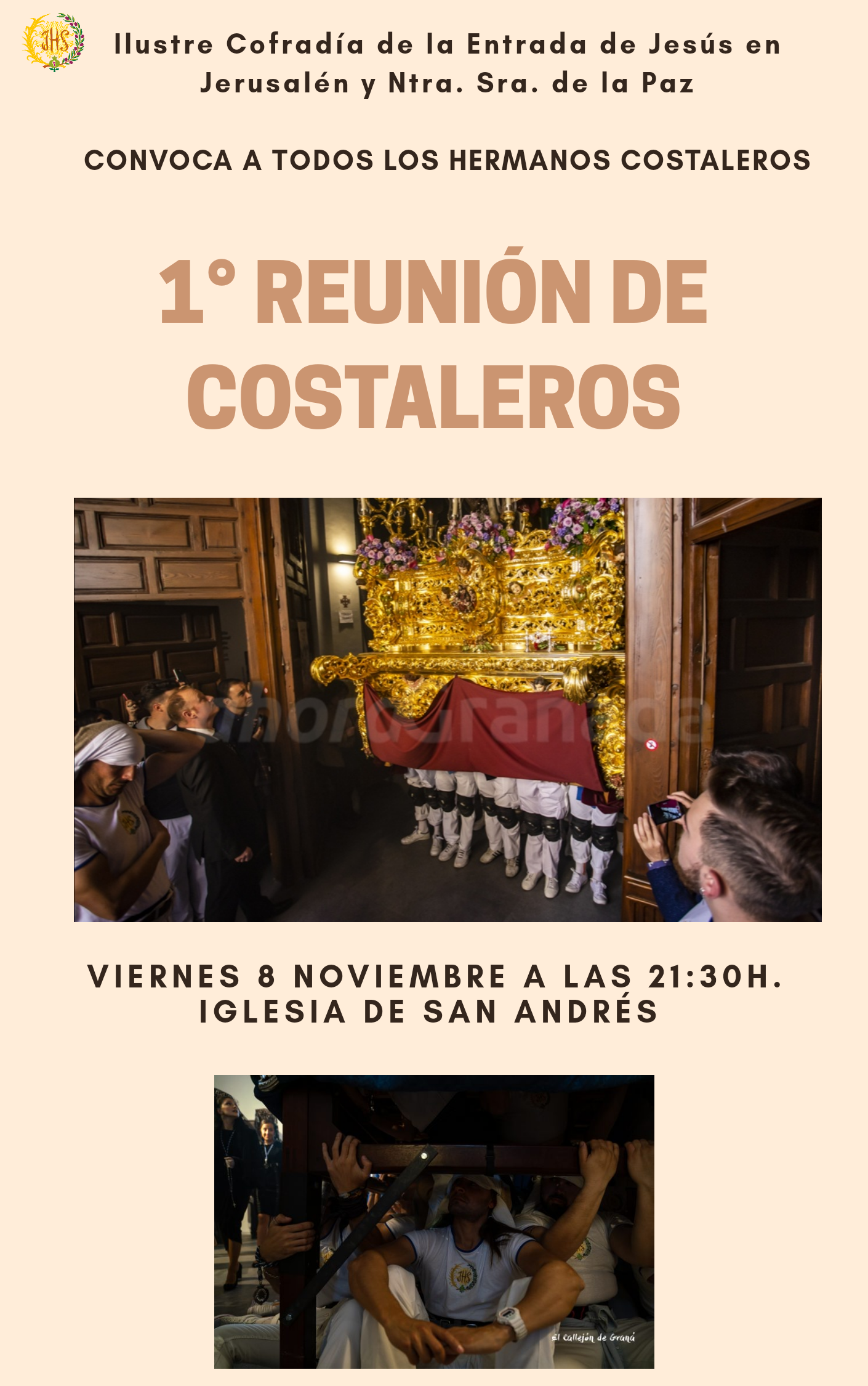 La Ilustre Cofradía de la Entrada de Jesús en Jerusalén y Ntra. Sra. de la Paz convoca a todos los hermanos costaleros a la primera reunión de costaleros del año cofrade 2019/2020.