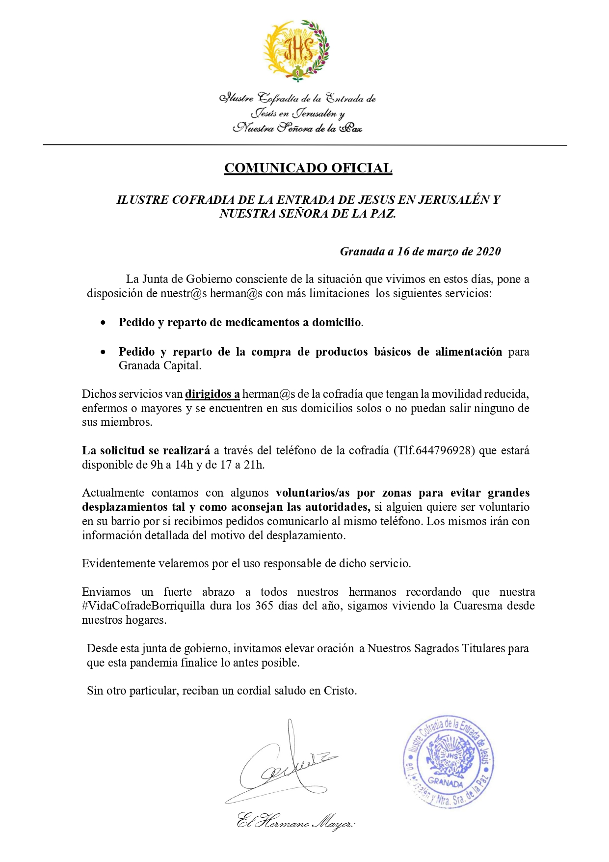 La Junta de Gobierno consciente de la situación que vivimos en estos días, pone a disposición de nuestr@s herman@s con más limitaciones los siguientes servicios: