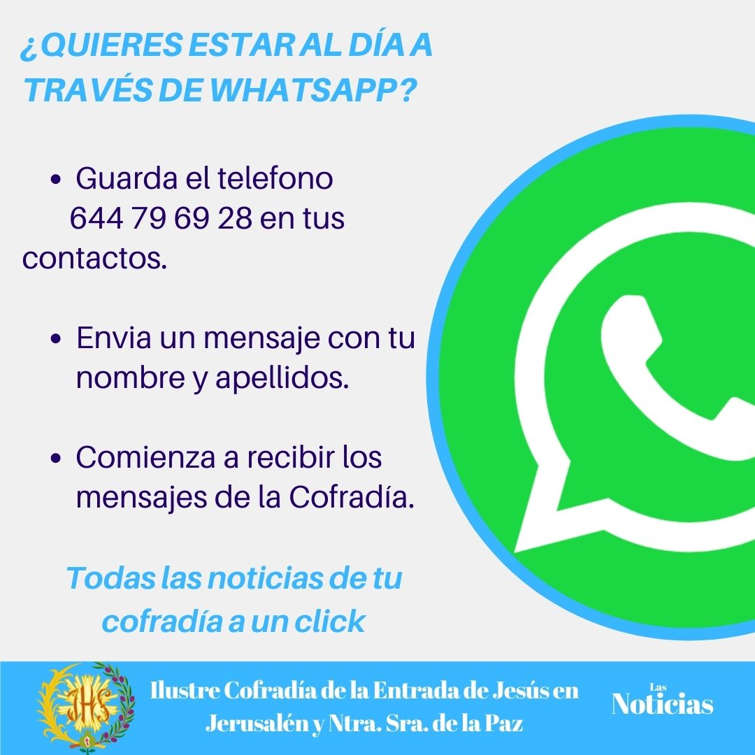 Si deseas recibir información actualizada a un click, a través de mensajes por WhatsApp, debes añadir el siguiente número de teléfono a la agenda de su teléfono móvil: 644 79 69 28. A continuación envía un mensaje con tu nombre y apellidos, y empezarás a recibir los mensajes de la cofradía. ¡Así de fácil!