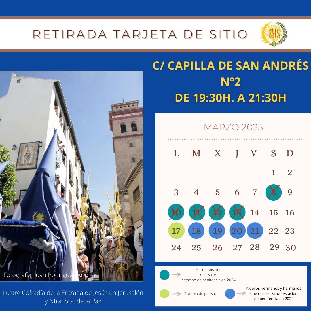 Seguimos caminando hacia el Domingo de Ramos. Mañana lunes, 17 de marzo, se abre casa de hermanadad para retirada de hábitos para los cambios de puestos, y cierre de puestos. Del martes al viernes, retirada de tarjetas de sitio y hábitos para los nuevos hermanos y los que no hicieron estación de penitencia en el año 2024.