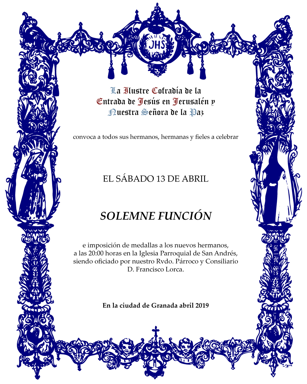Invitamos a todos los hermanos y las hermanas, amigos y simpatizantes a la Solemne Función que celebraremos el próximo sábado 13 de abril a las 20:00h en la Iglesia Parroquial de San Andrés.
