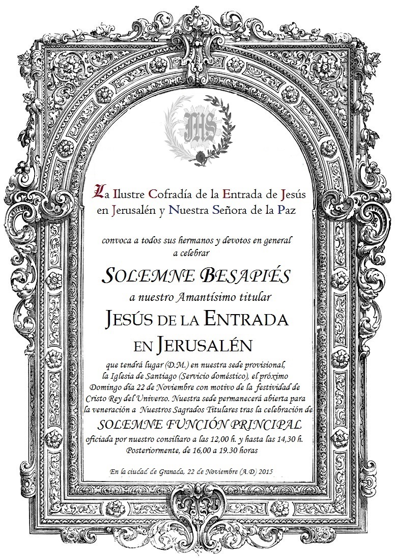 La Ilustre Cofradía de la Entrada de Jesús en Jerusalén y Nuestra Señora de la Paz convoca a todos sus hermanos y devotos en general a celebrar Solemne Besapiés a la Sagrada Imagen de Jesús de la Entrada en Jerusalén.