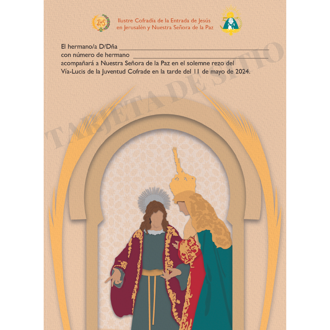 La tarjeta la preside un arco de herradura típico de la arquitectura nazarí, escoltado por dos palmas lisas, siendo una de las señas de identidad de la cofradía, sobre fondo emulando al color de los monumentos del barrio del Albayzín. En el interior del arco, la virgen de la Paz como titular que preside el acto acompañada de San Juan Evangelista representando a la Juventud Cofrade como patrón de la misma, todo esto basado en una imagen pasada a dibujo del último Vía-Lucis que presidió nuestra titular mariana y fondo con celosía típica.