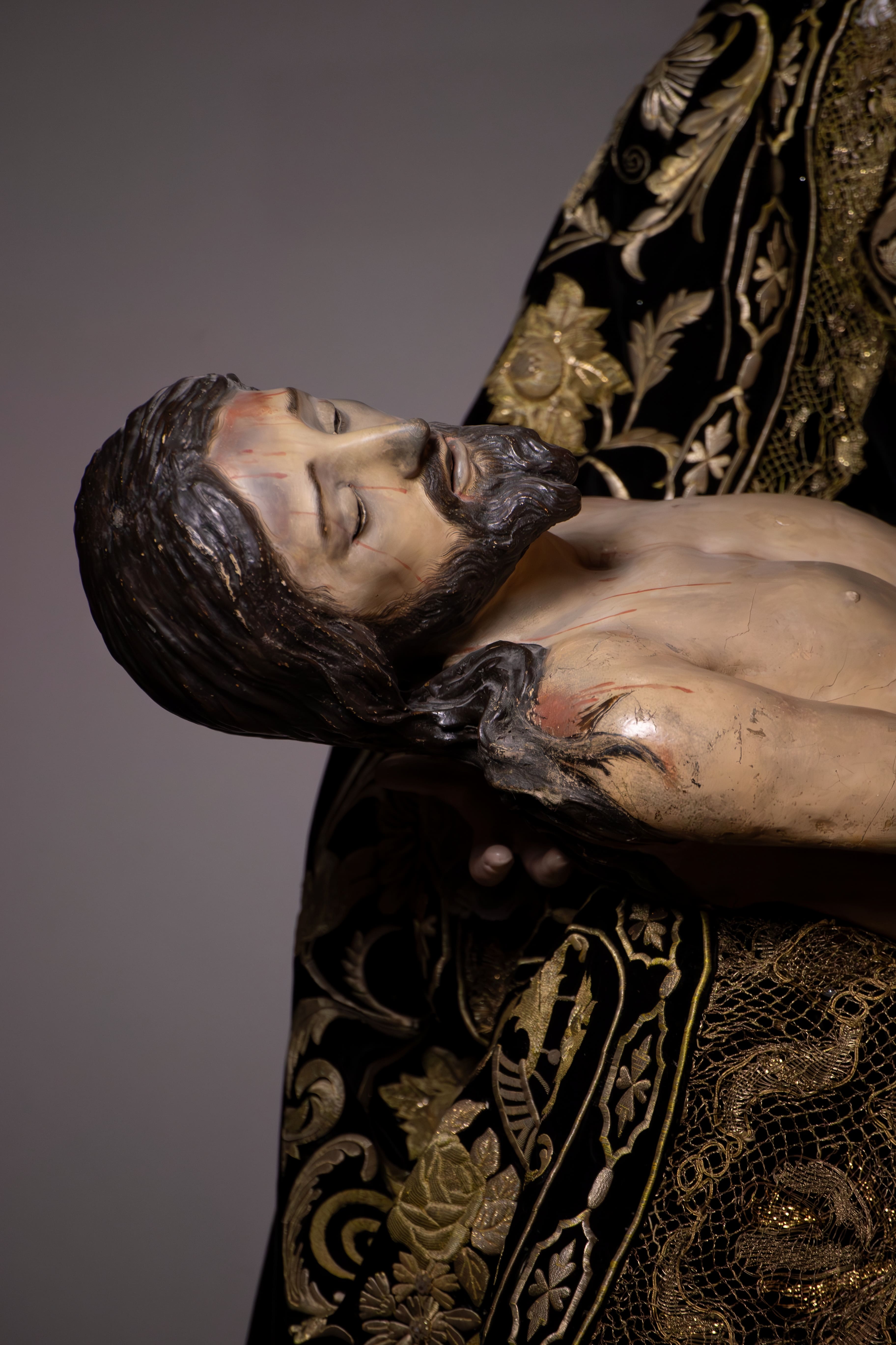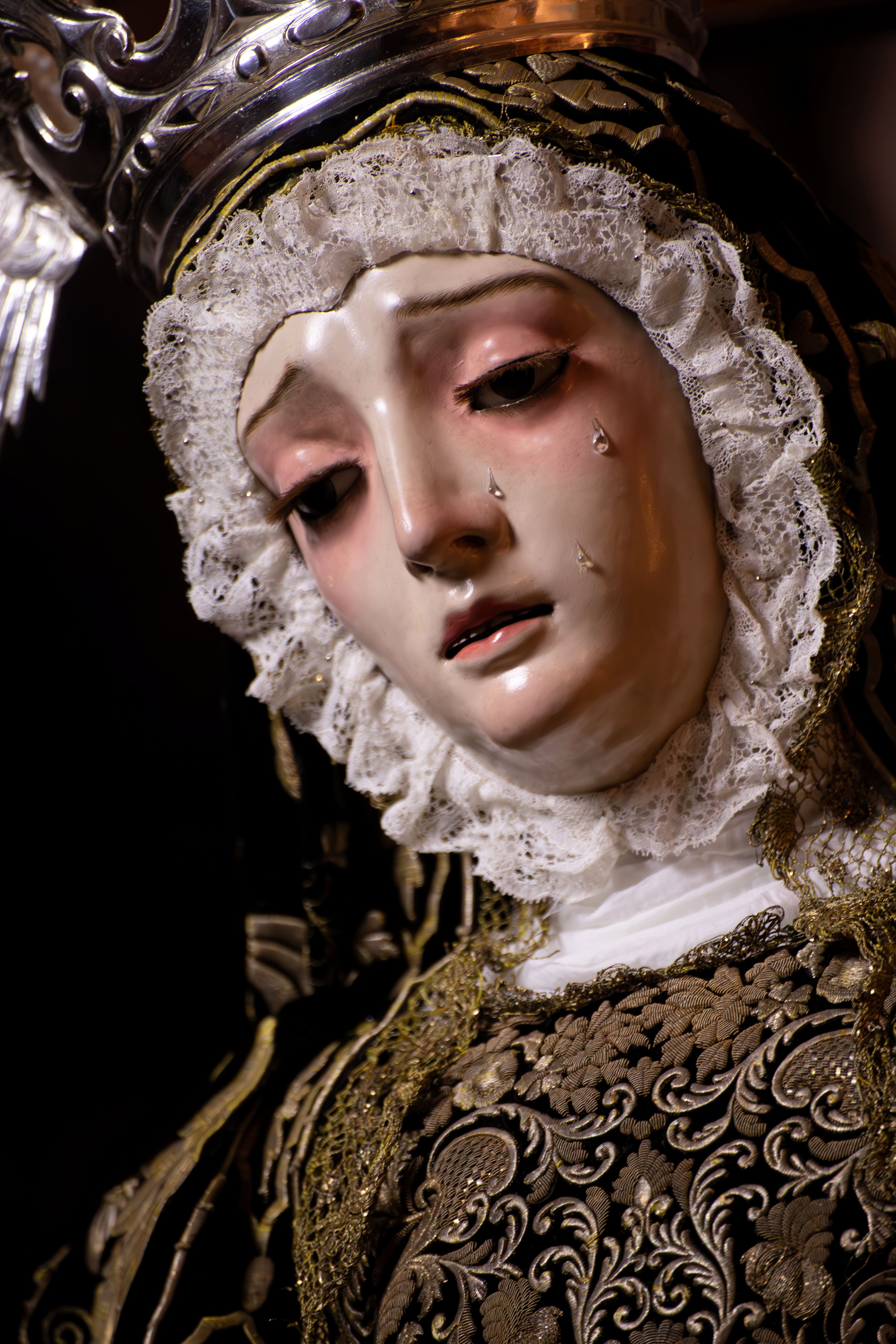 Para esta ocasión, la imagen ha sido ataviada por el vestidor Jorge Heredia, presentándose con una estética de profundo carácter historicista que recrea los modos en los que procesionó en el Santo Entierro Antológico de 1913. La Santísima Virgen luce el manto ajustado a la cabeza, configurando una silueta recogida y sobrecogedora, acompañado de un rostrillo de corte monjil elaborado con fino encaje, que enmarca el semblante doloroso de la imagen con sobriedad y elegancia. Completa el conjunto su terno de terciopelo negro bordado en oro, de gran riqueza y solemnidad. Todo ello conforma una estampa de gran fuerza devocional que conecta directamente con la tradición histórica de la corporación.