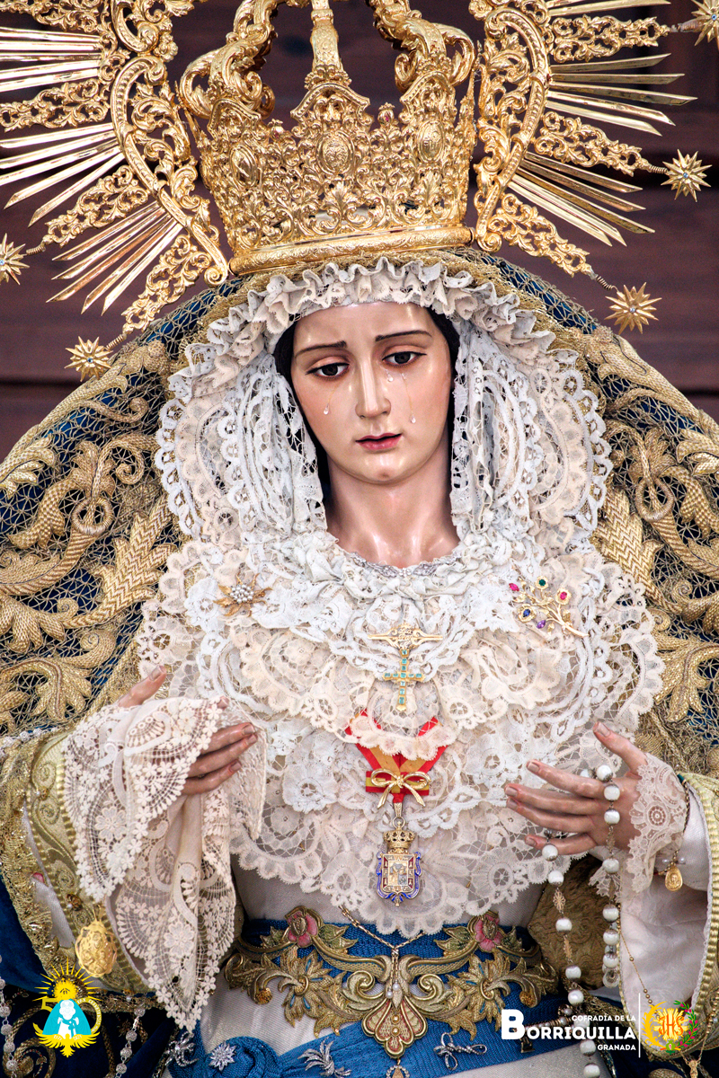 Luce saya bordada en oro y sedas de colores sobre tisú de plata, tocado elaborado con un encaje de punto Duquesa, manto bordado del L aniversario y toca de sobremanto bordada. Luce la corona de plata sobredorada, regalo de su XXV aniversario.