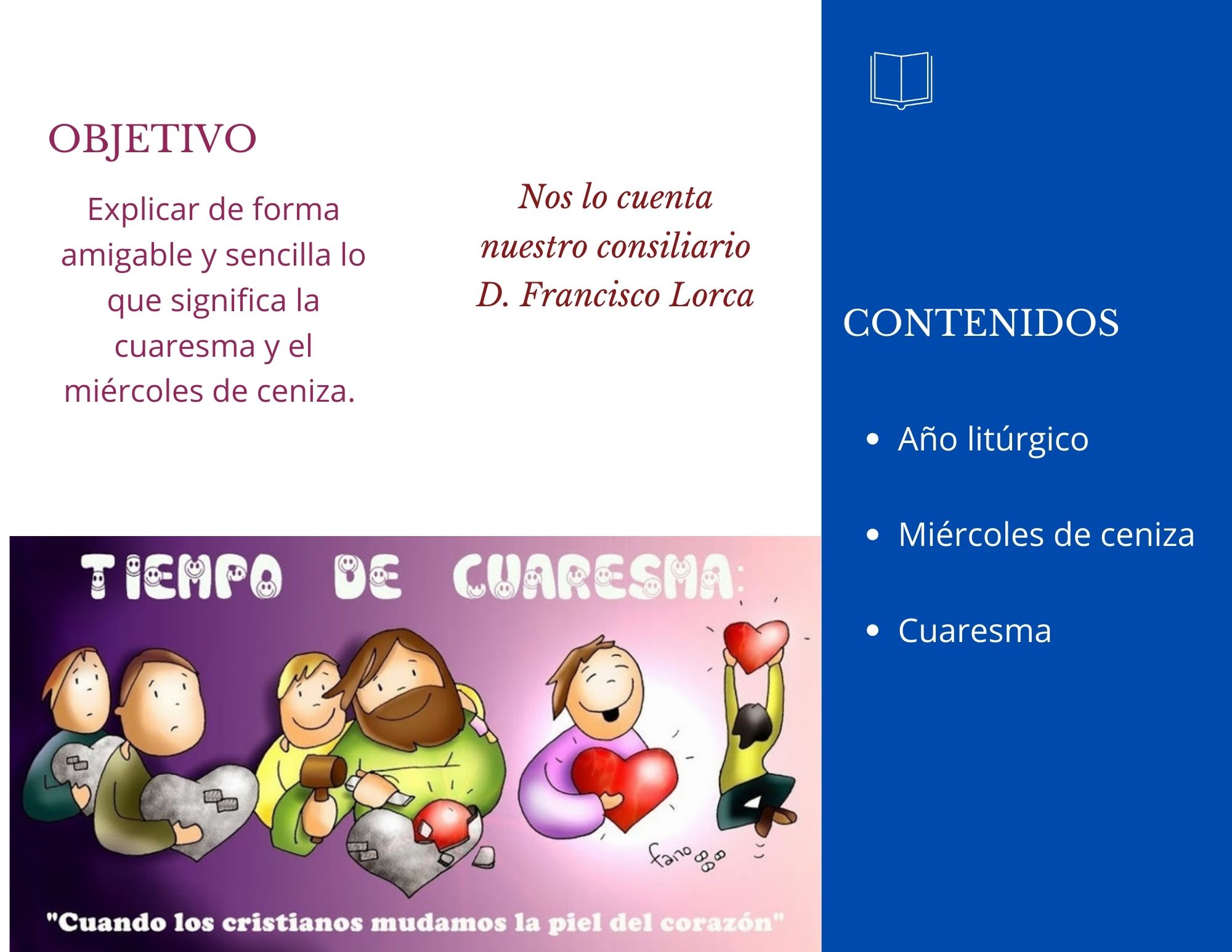 El objetivo de esta formación es explicar de forma sencilla y amigable qué significa el Miércoles de Ceniza y la Cuaresma. Los contenidos que trata nuestro consiliario son el año litúrgico, el Miércoles de Ceniza y la Cuaresma, terminando con unas palabras que dirige a todos los hermanos y hermanos de la Cofradía de "La Borriquilla".